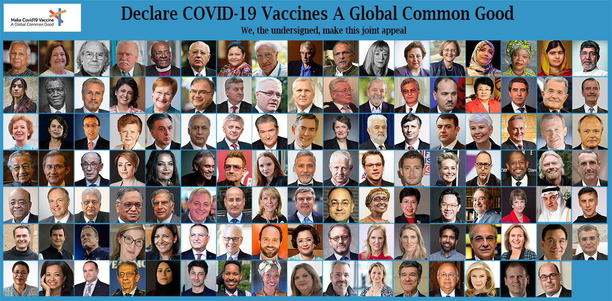 Muhammad Yunus, Desmond Tutu, Mikhail Gorbachev, Malala Yousafzai, Bono, Richard Branson, Lech Walesa, Jody Williams, Mahathir Mohamad, Lula, George Clooney, Sharon Stone, Forest Whitaker, Leymah Gbowee, Mary Robinson, Tawakkol Karman, Ratan Tata, Azim Premji, Shabana Azmi, Anne Hidalgo, Thomas Bach, Andrea Bocelli and other World Leaders Appeal To Declare Corona Vaccine A Global Common Good.
