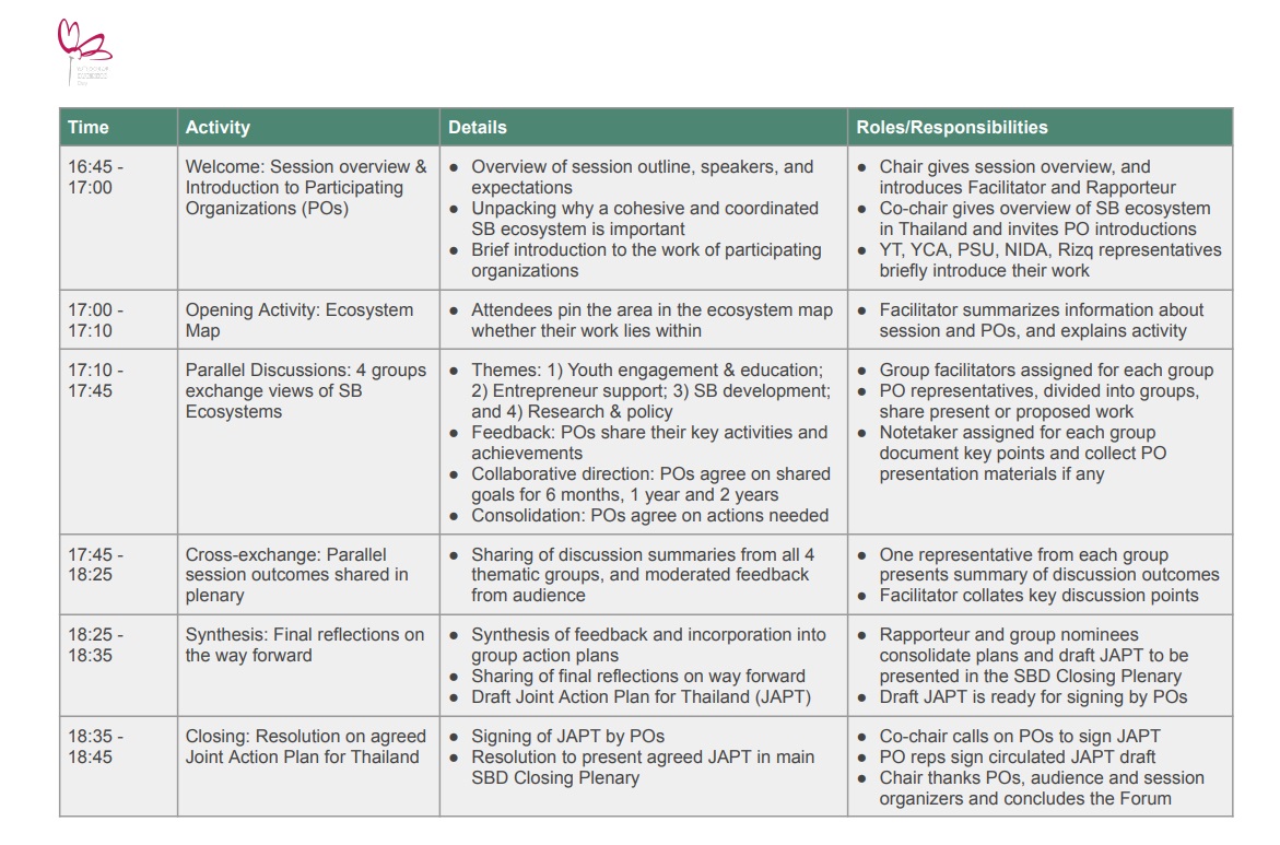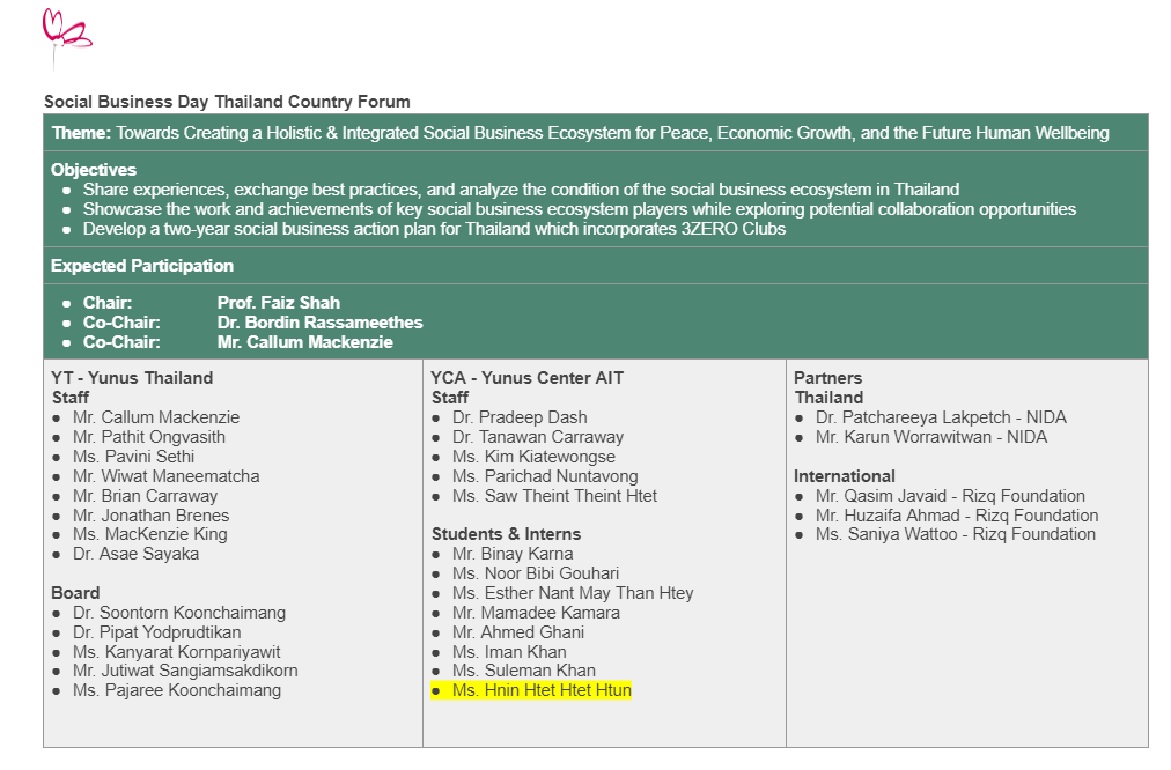 The Thailand Country Forum will aim to facilitate conversations among countries with thriving social business ecosystems. The forum will allow participants to share experiences, explore opportunities, and analyze the implementation of social businesses within the country and region, with a focus on developing action plans for the future. There will be at least 15 persons to form a forum.