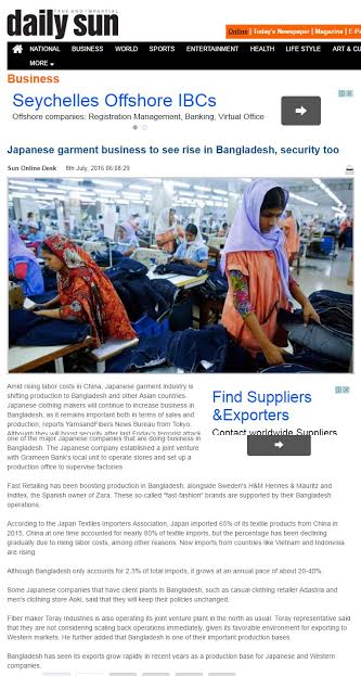 Amid rising labor costs in China, Japanese garment industry is shifting production to Bangladesh and other Asian countries. Japanese clothing makers will continue to increase business in Bangladesh, as it remains important both in terms of sales and production, reports YarnsandFibers News Bureau from Tokyo. Although they will boost security after last Friday's terrorist attack in Dhaka.Fast Retailing, the operator of the Uniqlo casualwear chain, is one of the major Japanese companies that are doing business in Bangladesh. The Japanese company established a joint venture with Grameen Bank's local unit to operate stores and set up a production office to supervise factories.Fast Retailing has been boosting production in Bangladesh, alongside Sweden's H&M Hennes & Mauritz and Inditex, the Spanish owner of Zara. These so-called "fast-fashion" brands are supported by their Bangladesh operations.According to the Japan Textiles Importers Association, Japan imported 65% of its textile products from China in 2015. China at one time accounted for nearly 80% of textile imports, but the percentage has been declining gradually due to rising labor costs, among other reasons. Now imports from countries like Vietnam and Indonesia are rising.Although Bangladesh only accounts for 2.3% of total imports, it grows at an annual pace of about 20-40%.Some Japanese companies that have client plants in Bangladesh, such as casual clothing retailer Adastria and men's clothing store Aoki, said that they will keep their policies unchanged.