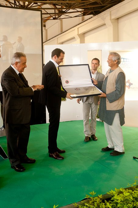 Caption: Nobel Peace Laureate Professor Muhammad Yunus presenting the plaque of Social Business city to the Mayor of Pistoia city, Italy, Samuele Bertinelli.