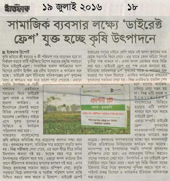 কৃষি জমিতে কী ধরনের ও কী পরিমাণ সার প্রয়োজন হবে তা নির্ধারণ করতে মাটি পরীক্ষায় বিশেষ ধরনের প্রযুক্তি সহায়তা দিবে ডাইরেক্ট ফ্রেশ। সামাজিক ব্যবসা কার্যক্রমের অংশ হিসেবে গ্রামীণ ইন্টেল এর যৌথ উদ্যোগে এ কার্যক্রম শুরু হচ্ছে। ডাইরেক্ট ফ্রেশ ইতিমধ্যে মানিকগঞ্জের ৯শ’ কৃষকের মধ্যে এ কার্যক্রম শুরু করে ভালো সাড়া পেয়েছে। এছাড়া সবজি উত্পাদন ও গাভী পালনেও একইভাবে সহায়তা দিবে ডাইরেক্ট ফ্রেশ নামক এ সামাজিক ব্যবসা কার্যক্রম। এ উদ্যোগকে টেকসই করতে বিভিন্ন বেসরকারি সংস্থা মডেলের (এনজিও) বাইরে এসে মূলত মুনাফা’র ভিত্তিতে এ কার্যক্রম পরিচালনা করা হবে।
