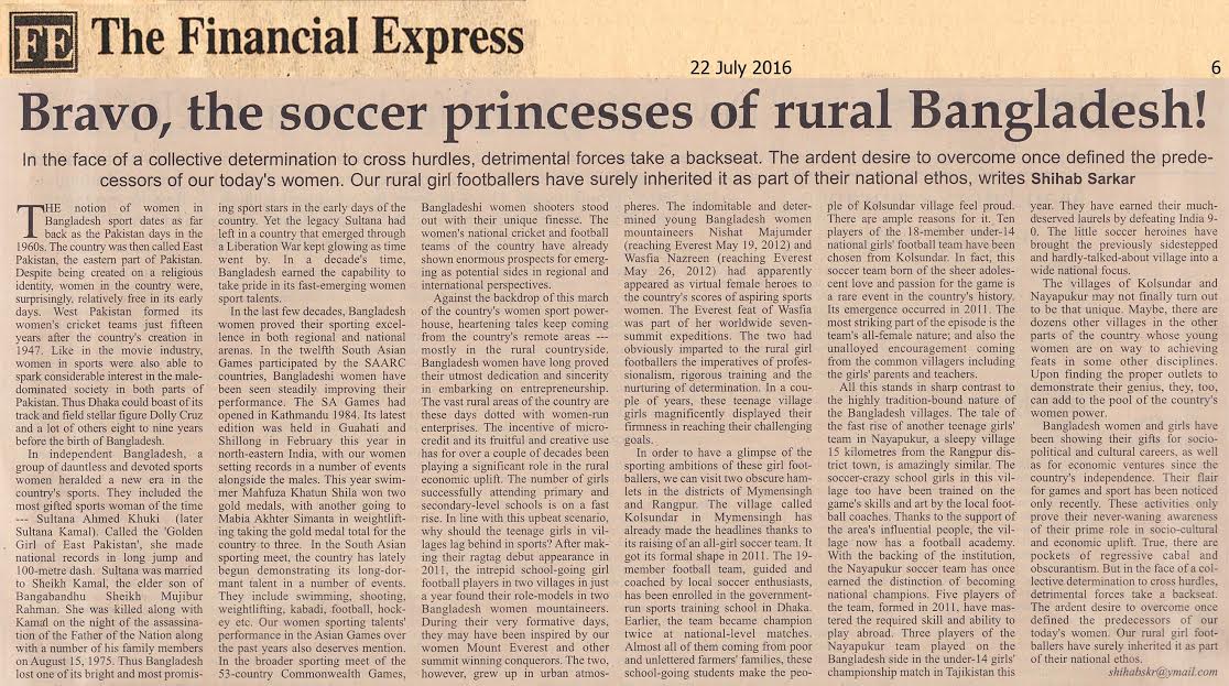 Bangladesh women and girls have been showing their gifts for socio-political and cultural careers, as well as for economic ventures since the country's independence. Their flair for games and sport has been noticed only recently. These activities only prove their never-waning awareness of their prime role in socio-cultural and economic uplift. True, there are pockets of regressive cabal and obscurantism. But in the face of a collective determination to cross hurdles, detrimental forces take a backseat. The ardent desire to overcome once defined the predecessors of our today's women. Our rural girl footballers have surely inherited it as part of their national ethos.