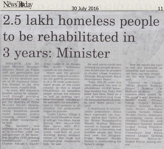 DINAJPUR, July 29: Land Minister Shamsur Rahman Sherif on Friday said the government has taken initiatives to rehabilitate 2.5 lac destitute people of 50 thousand homeless families in the next three years, reports BSS. "At least 800 homeless families would be rehabilitated through providing shelters and land . . . as per the directive of Prime Minister Sheikh Hasina, the government is rehabilitating homeless people under Ashrayan project creating cluster village with power connections," he said. The minister was addressing as chief guest at a function after the inauguration of 30 homeless families' (150 persons) rehabilitation under Cluster Village-1 (Guch-chha Gram-1) at Bangla Hili under Hakimpur upazila in the district. Sherif said the government has targeted to alleviate the poverty permanently of 1.10 crore underprivileged people of the entire country so that it would rehabilitate all homeless people across the country as well as develop their socio-economic condition. He said with the rehabilitation of 150 persons of 30 families, the programme began its journey. "Under Cluster Village-2 level, every homeless family will get two-room house having 300 square-feet floor space with RCC (Reinforced concrete column), tube-well of pure drinking water, sanitary latrine of five rings and multipurpose community hall," he said. He said micro-credit and training on income-generation would also be provided to cluster village residents through Bangladesh Rural Development Board. "Taka 258.29 crore has been allocated this year to rehabilitate 10,000 homeless families but Taka 960 crore has been fixed as a cost of rehabilitating more 50 thousand families within next three years," he said. A beneficiary of rehabilitation programme, Abdur Rouf expressed his reaction saying that Father of the Nation Bangabandhu Sheikh Mujibur Rahman wanted to manage shelter and lands to homeless and landless people like them and now his daughter Prime Minister Sheikh Hasina is materializing his father's pledge. "Now we would not have to live our livelihood as homeless and landless . . .we have our own shelter . .we are very happy," he said. Chaired by Cluster Village Project National Project Director M Mahbub-ul-Alam, the function was joined by Dinajpur-6 seat lawmaker Shibli Sadik, Cluster Village Project Deputy Project Director Nurul Amin Sarker, Hakimpur Upazila Nirbahi Officer Shukria Parvin, Hakimpur municipality mayor Jamil Hossain Chalanto and Hakimpur Upazaila Awami League Acting President Imdadul Haque Chowdhury and Poura Awami League General Secretary Harun-or-Rashid Harun, among others.