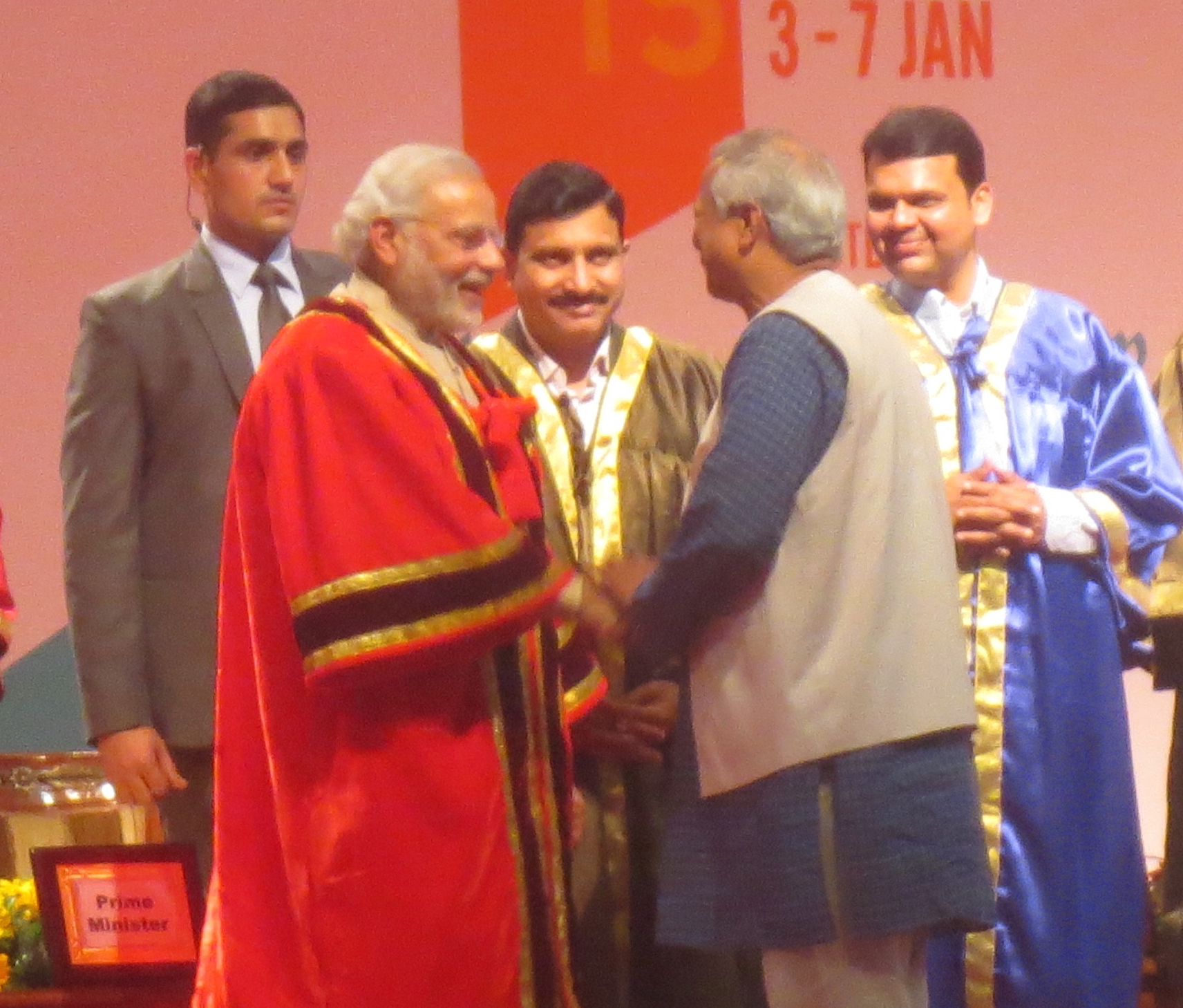 Narendra Modi, Prime Minister of India, presenting a gold medal to Nobel Laureate Professor Muhammad Yunus for "giving the poorest a life of hope, opportunity and dignity" at the opening ceremony of the 102nd Indian Science Congress in the presence of 12,000 delegates in Mumbai on January 3. Also seen in the photo are Indian Union Minister for Science and Technology Dr Harsh Vardhan and Maharashtra Chief Minister Devendra Fadnavis.