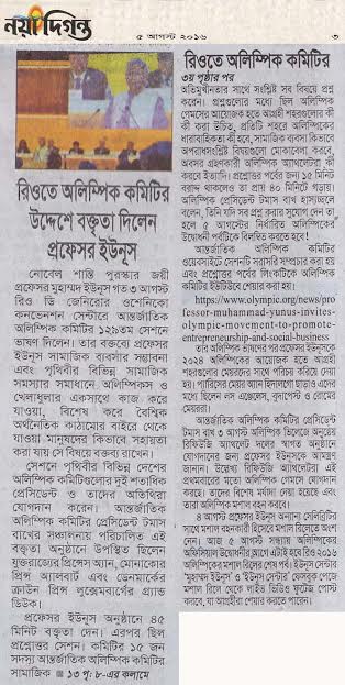আন্তর্জাতিক অলিম্পিক কমিটির ১২৯তম সেশনে ভাষণ দিয়েছেন নোবেল শান্তি পুরস্কার জয়ী প্রফেসর মুহাম্মদ ইউনূস। বুধবার রিও ডি জেনিরোর ওশেনিকো কনভেনশন সেন্টারে দেয়া বক্তব্যে প্রফেসর ইউনূস সামাজিক ব্যবসার সম্ভাবনা এবং পৃথিবীর বিভিন্ন সামাজিক সমস্যার সমাধানে অলিম্পিকস ও খেলাধুলার একসঙ্গে কাজ করে যাওয়া বিশেষ করে বৈশ্বিক অর্থনৈতিক কাঠামোর বাইরে থেকে যাওয়া মানুষদের কিভাবে সহায়তা করা যায় সে বিষয়ে বক্তব্য রাখেন।