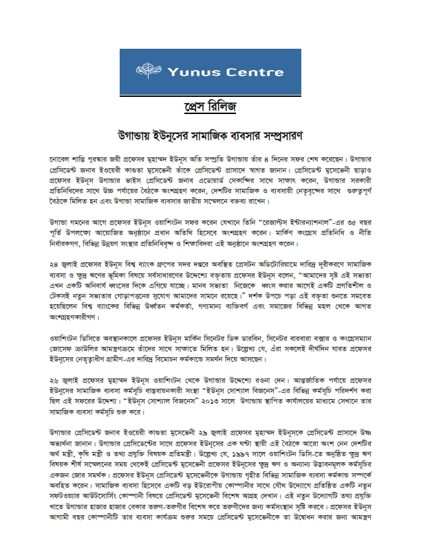 উনড়বয়নে ভুমিকা রাখতে পারে সে বিষয়ে প্রেসিডেন্ট মুসেভেনী বিশেষভাবে জানতে চান। প্রফেসর ইউনূস পৃথিবীর অন্যান্য