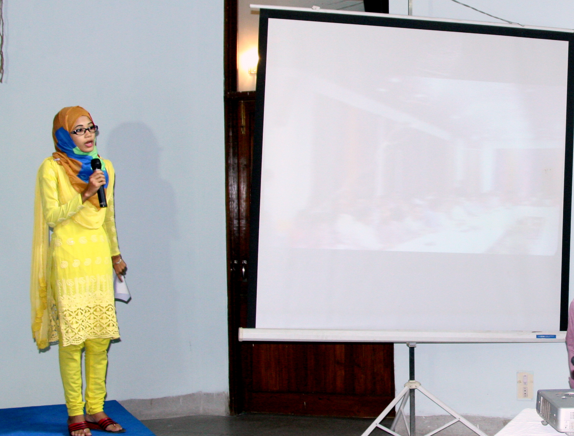 Caption for image two: Most. Fahmida Tanjim, a 23 year old Nobin Udyakta (New Entrepreneur) and daughter of Grameen Bank borrower of 10 years, presenting her business plan on setting up Ladies Shop & Parlor. She has 3 Months training on handicraft from youth development programme. Her proposal to set up her business with an investment of Tk 2, 00,000 from Grameen Kalyan has been approved.
