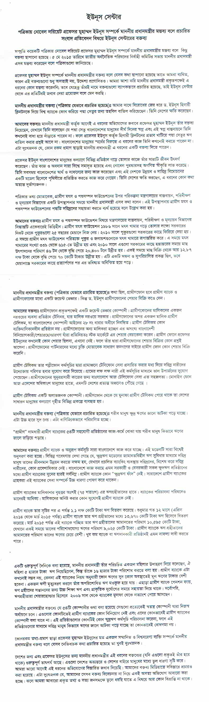 সম্প্রতি কয়েকটি পত্রিকায় নোবেল লরিয়েট প্রফেসর মুহাম্মদ ইউনূস সম্পর্কে মাননীয় প্রধানমন্ত্রীর মন্তব্য বলে কিছু বক্তব্য ছাপানো হয়েছে। ৫ মে ২০১৫ তারিখে জাতীয় অর্থনৈতিক পরিষদের নির্বাহী কমিটির সভায় মাননীয় প্রধানমন্ত্রী এসব মন্তব্য করেছেন বলে পত্রিকাগুলো জানিয়েছে।