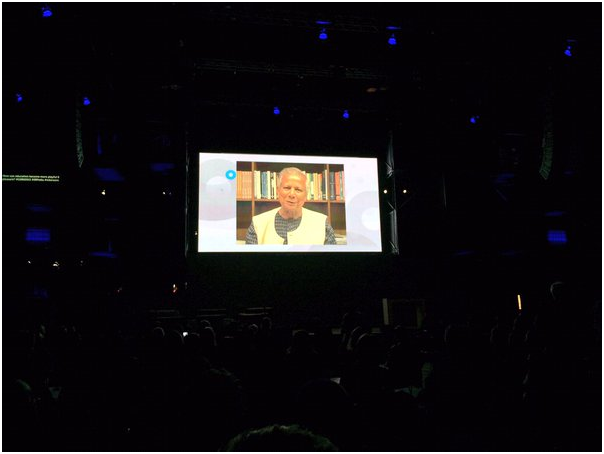 ছবি-১ঃ ৪ নভেম্বর ২০১৫ তারিখে জার্মানীর বার্লিনে শুরু ৭ম বিশ্ব সামাজিক ব্যবসা শীর্ষ সম্মেলনে ৬০টি দেশ থেকে আগত আট শতাধিক অংশগ্রহণকারী নোবেল লরিয়েট প্রফেসর মুহাম্মদ ইউনূসের ভিডিও বার্তা শুনছেন।