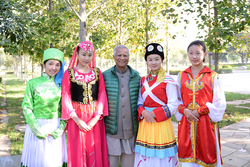 ছবিঃ প্রফেসর ইউনূসের সাথে ঐতিহ্যবাহী রঙীন পোষাকে চীনের কুনমিংয়ের ইউনান সাধারণ বিশ্ববিদ্যালয়ের ছাত্রীরা।