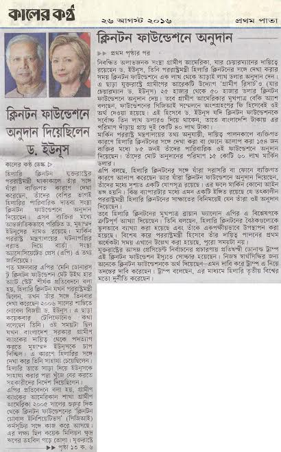 গত মঙ্গলবার এপির ‘মেনি ডোনারস টু ক্লিনটন ফাউন্ডেশন মেট উইথ হার অ্যাট স্টেট’ শীর্ষক প্রতিবেদনে বলা হয়, হিলারি ক্লিনটন যখন পররাষ্ট্রমন্ত্রী ছিলেন, তখন তাঁর সঙ্গে তিনবার দেখা করেছেন ২০০৬ সালের শান্তিতে নোবেল বিজয়ী ড. ইউনূস। এ ছাড়া কয়েকবার টেলিফোনেও কথা বলেছেন তিনি। ওই সময়টা ছিল যখন বাংলাদেশ সরকার গ্রামীণ ব্যাংকের দায়িত্ব থেকে পদত্যাগ করতে মুহাম্মদ ইউনূসকে চাপ দিচ্ছিল। এ কারণে হিলারির সঙ্গে দেখা করে তিনি সাহায্য চেয়েছিলেন। হিলারি তাতে সাড়া দিয়ে ইউনূসকে সাহায্য করার পন্থা খুঁজে বের করতে সহকারীদের নির্দেশ দিয়েছিলেন।
