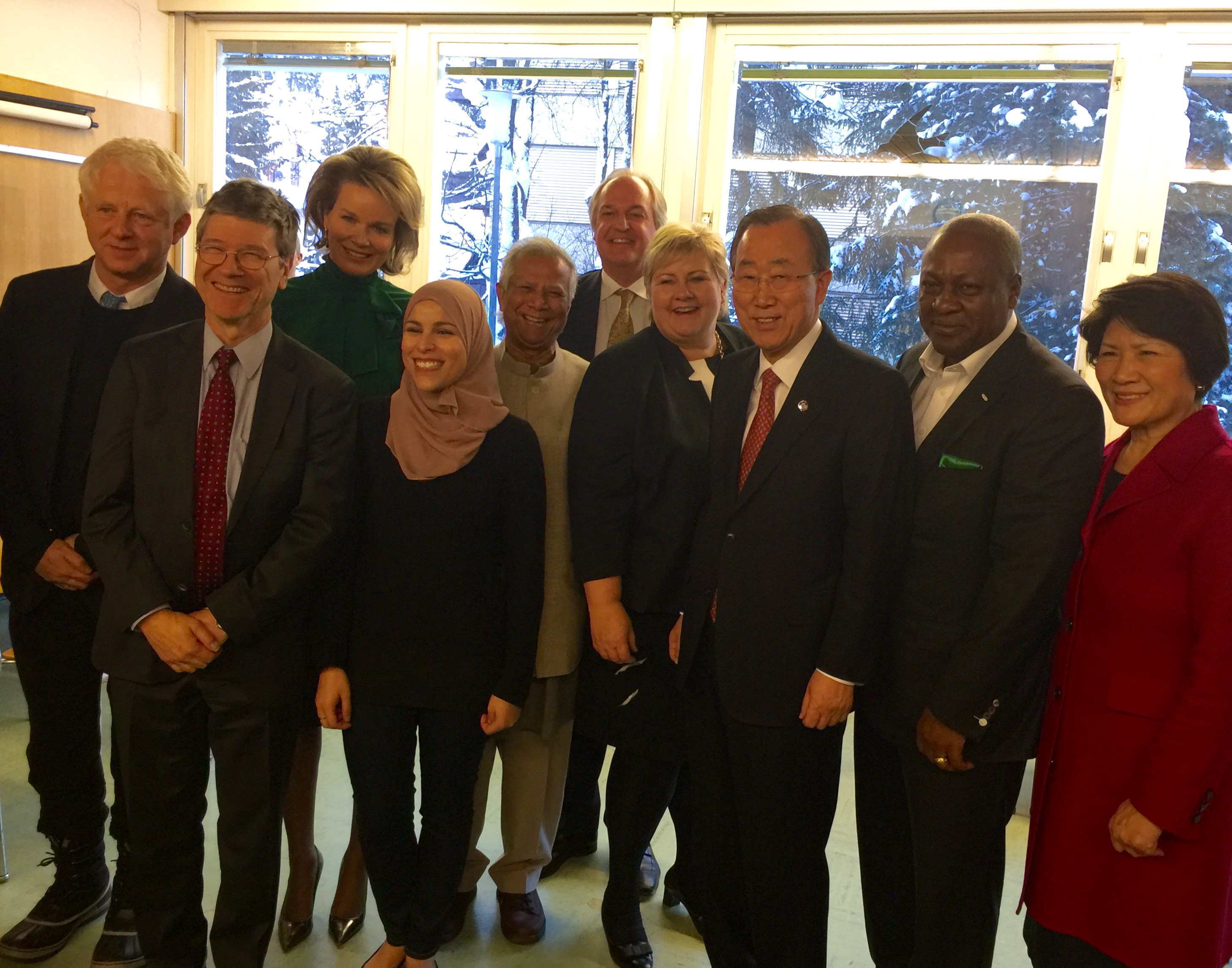Photo Caption: The members of the just announced UN SDG Advocates Group with UN Secretary General Ban Ki Moon in Davos on January 21. From left to right, British filmmaker and activist Richard Curtis, Professor Jeffrey Sachs, HM Queen Mathilde of Belgium, Libyan activist Alaa Murabit, Professor Muhammad Yunus, Unilever CEO Paul Polman, Prime Minister Erna Solberg of Norway, UN Secretary General Ban Ki Moon, President Mahama of Ghana, Ambassador Dho from South Korea