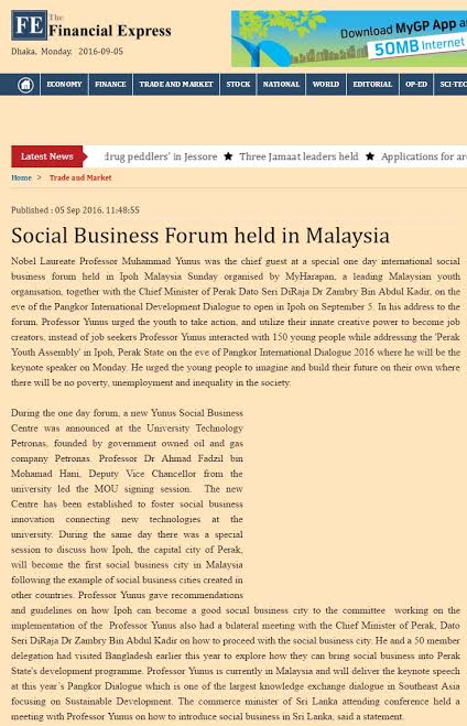 Nobel Laureate Professor Muhammad Yunus was the chief guest at a special one day international social business forum held in Ipoh Malaysia Sunday organised by MyHarapan, a leading Malaysian youth organisation, together with the Chief Minister of Perak Dato Seri DiRaja Dr Zambry Bin Abdul Kadir, on the eve of the Pangkor International Development Dialogue to open in Ipoh on September 5. In his address to the forum, Professor Yunus urged the youth to take action, and utilize their innate creative power to become job creators, instead of job seekers Professor Yunus interacted with 150 young people while addressing the 'Perak Youth Assembly' in Ipoh, Perak State on the eve of Pangkor International Dialogue 2016 where he will be the keynote speaker on Monday. He urged the young people to imagine and build their future on their own where there will be no poverty, unemployment and inequality in the society.