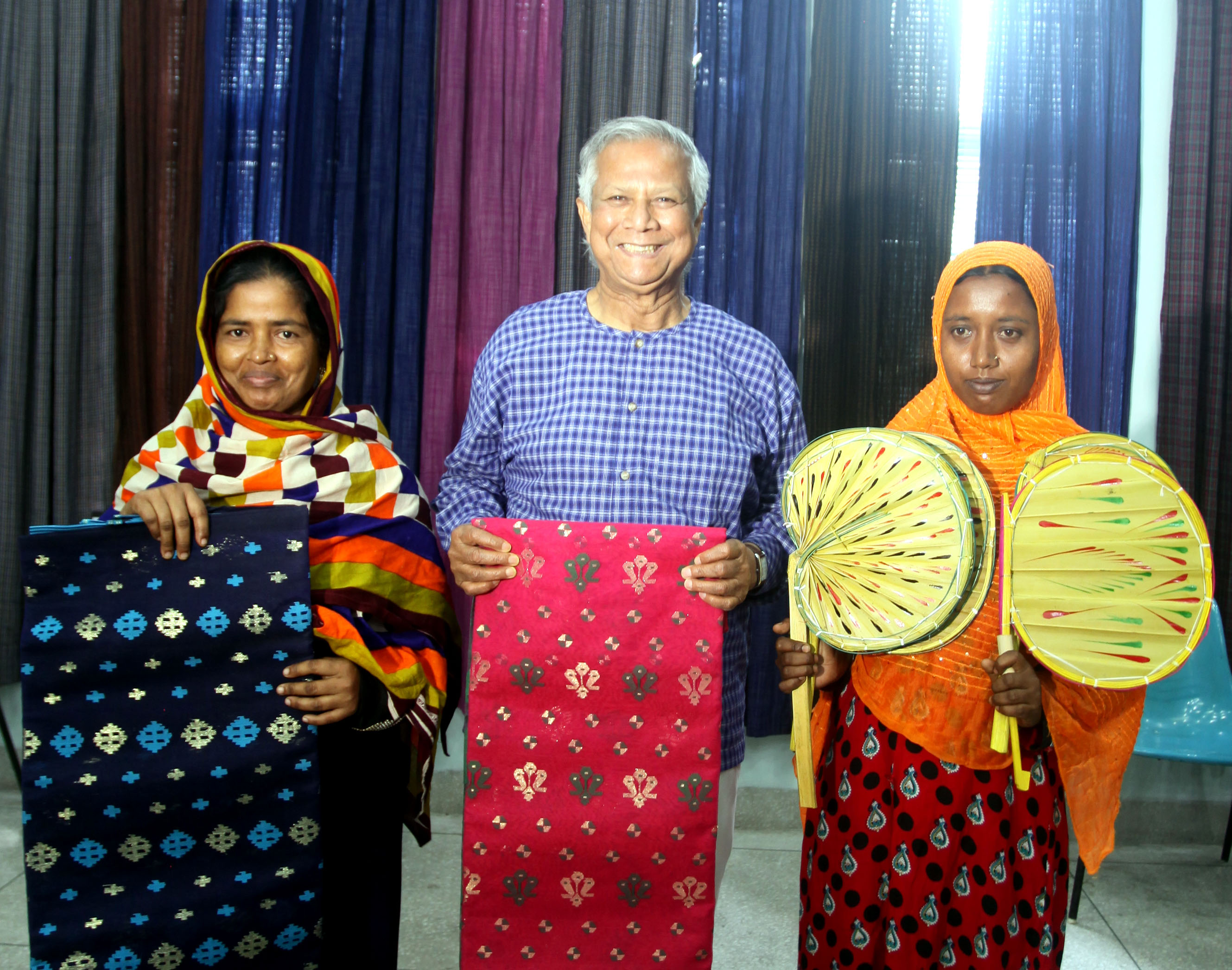 Caption for image two: New Entrepreneurs Mst. Asma Begum is seen holding traditional palm leaf hand-fans and Mst. Pervin with Jamdani Sari are seen in the photo with Nobel Laureate Professor Muhammad Yunus. Photo: Nasir Al Mamun/Yunus Centre