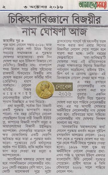 শুরু হলো নোবেল সপ্তাহ-২০১৬। আজ সোমবার থেকে পর্দা উঠছে বিশ্বের সবচেয়ে সম্মানজনক এ পুরস্কার ঘোষণার আয়োজন। প্রথম দিন ঘোষণা করা হবে চিকিৎসা বিজ্ঞানে (বা মেডিসিন) বিজয়ীর নাম। বাংলাদেশ সময় বিকাল সাড়ে ৩টায় সুইডেনের রাজধানী স্টকহোমে বিজয়ীর নাম ঘোষণা করবেন নোবেল কমিটির সচিব (মেডিসিন) থমাস পার্লম্যান। নোবেল কমিটির নিজস্ব ওয়েবসাইট নোবেলপ্রাইজ ডটঅর্গ সংবাদ বিজ্ঞপ্তিতে এ তথ্য দিয়েছে।