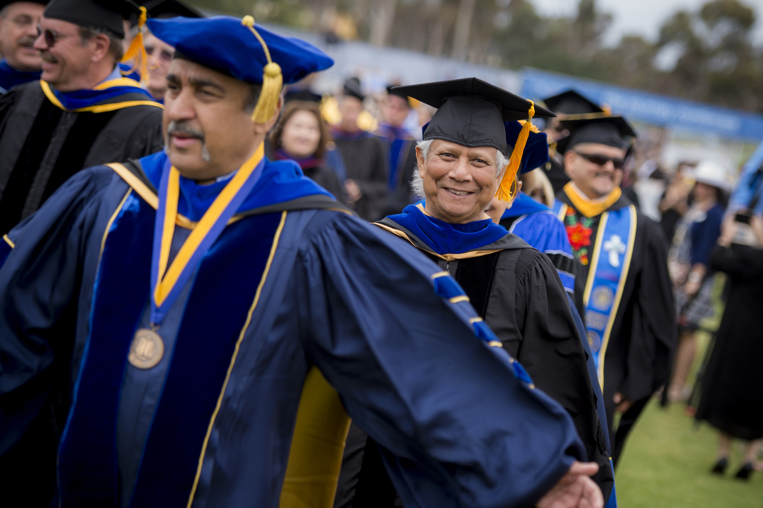 Caption 1 : Nobel Peace Laureate Professor Muhammad Yunus is seen at the Commencement procession of University of California at San Diego led by its Chancellor Pradeep Khosla on 11 June 2016.