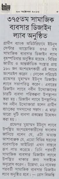 গ্রামীণ ব্যাংক অডিটরিয়ামে ইউনূস সেন্টার আয়োজিত ৩৭৫ তম সামাজিক ব্যবসার ডিজাইন ল্যাব বৃহস্পতিবার অনুষ্ঠিত হয়েছে। বিভিন্ন জাতীয় ও আন্তর্জাতিক সংস্থার প্রায় ১৬০ জন অংশগ্রহণকারী এই ল্যাবে অংশগ্রহণ করেন । নোবেল লরিয়েট প্রফেসর মুহাম্মদ ইউনূস ডিজাইন ল্যাবে সভাপতিত্ব করেন। এবারের ডিজাইন ল্যাবে নবীন উদ্যোক্তাদের চারটি ব্যবসা পরিকল্পনা উপস্থাপন করা হয়। ডিজাইন ল্যাবে উপস্থাপিত সব নবীন উদ্যোক্তারা হলেন গ্রামীণ ব্যাংকের সদস্যদের সন্তান। এ ছাড়া আরো দুটি ব্যবসা প্রকল্পের উদ্বোধন করা হয়।