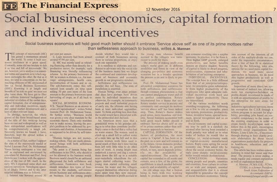 The concept of microcredit (MC) has gained a momentum around the world. To some it built economic resilience at a great speed. Contrarily, some did not hesitate to dub it as 'rise and fall of microcredit.' We are, however, yet to analyse it in numerical terms and quantum as to which segment outweighs the other. Be that as it may, we tend to concentrate on the far-reaching offshoots of MC envisioned of late i.e. Social Business Economics (SBE). Knowing it at length and breadth of 'no risk no gain' we must not play loose shots. We have got to filter and calibrate historical background of industrial revolution of the earlier days, capital formation, rise of entrepreneurship and individual incentives, equity and capital market development and a host of other relevant issues.