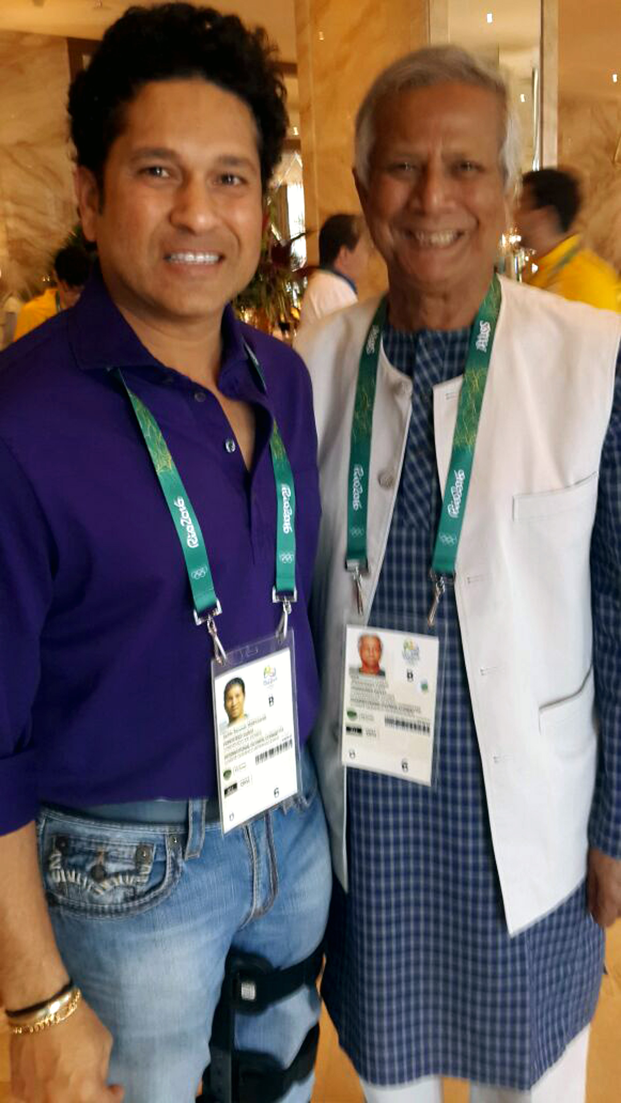 Nobel laureate Professor Yunus met cricket legend Sachin Tendulkar in Rio. They were in the VIP box of the stadium watching opening ceremony of the Rio Olympics. They told each other how much they have been admiring each other over the years. During their conversation Professor Yunus mentioned to him that he reached his amazing record of 100th century at the stadium in Dhaka just across the Grameen Bank Building. Tendulkar fondly remembered the occasion. This is one of the highest points in his career.