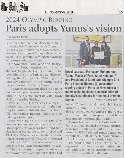 Paris, one of the three candidate cities bidding to host the 2024 Summer Olympic Games, has decided to give a central role to Nobel Laureate Professor Muhammad Yunus's three zeroes vision—zero poverty, zero unemployment and zero net carbon emissions.