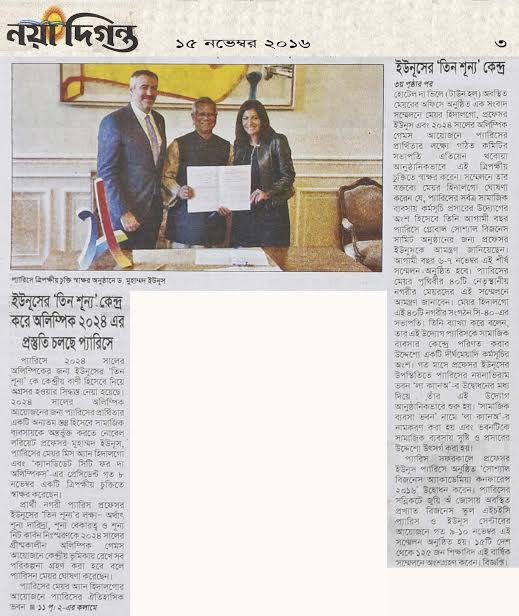 প্রার্থী নগরী প্যারিস প্রফেসর ইউনূসের ‘তিন শূন্য’র লক্ষ্যÑ অর্থাৎ শূন্য দারিদ্র্য, শূন্য বেকারত্ব ও শূন্য নিট কার্বন নিঃস্মরণকে ২০২৪ সালের গ্রীষ্মকালীন অলিম্পিক গেমস আয়োজনে কেন্দ্রীয় ভূমিকায় রেখে সব পরিকল্পনা গ্রহণ করা হবে বলে প্যারিসন মেয়র ঘোষণা করেছেন।