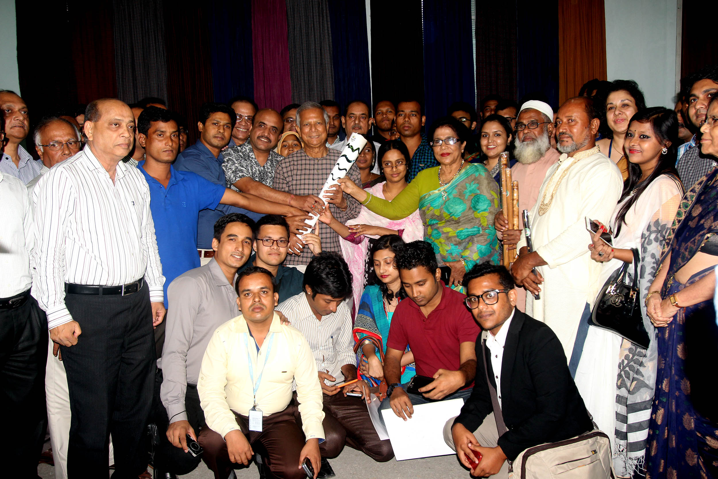 ছবির ক্যাপশন-২: ৩২৯তম সামাজিক ব্যবসা ডিজাইন ল্যাবে অংশগ্রহণকারীদের সাথে অলিম্পিক টর্চসহ নোবেল লরিয়েট প্রফেসর মুহাম্মদ ইউনূস। ইউনূস সেন্টারের আয়োজনে ২০ আগষ্ট ২০১৬ শনিবার গ্রামীণ ব্যাংক অডিটোরিয়ামে এই ডিজাইন ল্যাব অনুষ্ঠিত হয়। ছবি: ইউনূস সেন্টার।