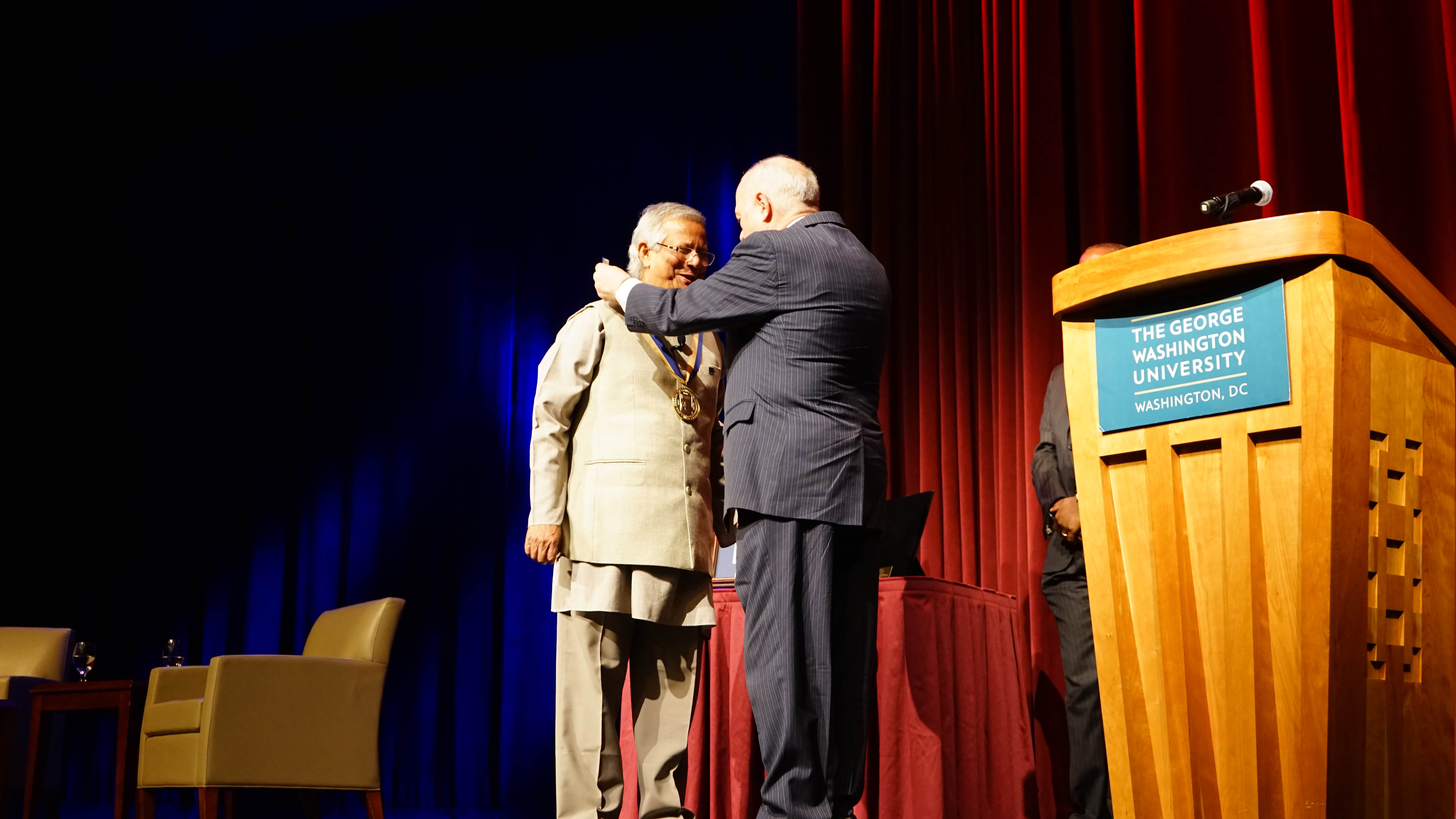 এছাড়াও প্রফেসর ইউনূস ২৬ অক্টোবর ২০১৬ জর্জ ওয়াশিংটন বিশ্ববিদ্যালয়ে একটি গণ-বক্তৃতা প্রদান করেন। ১৮২১ সালের ৯ ফেব্রুয়ারী  প্রতিষ্ঠিত এই বিশ্ববিদ্যালয় ফলিত রাষ্ট্রবিজ্ঞানের উপর মার্কিন যুক্তরাষ্ট্রের একটি নেতৃস্থানীয় বিশ্ববিদ্যালয়। ২৬ অক্টোবর সন্ধায় জর্জ ওয়াশিংটন বিশ্ববিদ্যালয়ের প্রেসিডেন্ট স্টিভেন ন্যাপ বিশ্ববিদ্যালয়ের লিনসের অডিটোরিয়ামে প্রফেসর ইউনূসকে ক্ষুদ্রঋণের মাধ্যমে অর্থনৈতিক উন্নয়নে তাঁর পথিকৃত কাজের জন্য মর্যাদাজনক প্রেসিডেনসিয়েল মেডেলে ভূষিত করেন। নিজ নিজ ক্ষেত্রে উল্লেখ্যযোগ্য সাহস, প্রত্যয় ও নেতৃত্ব প্রদর্শণকারী এবং নিজেদের কাজের মাধ্যমে সমাজে অন্যদের জীবনমান উন্নয়নে অসাধারণ অবদান সৃষ্টিকারী ব্যক্তিদের জর্জ ওয়াশিংটন বিশ্ববিদ্যালয়ের এই সম্মানজনক প্রেসিডেনসিয়েল মেডেল প্রদান করা হয়।