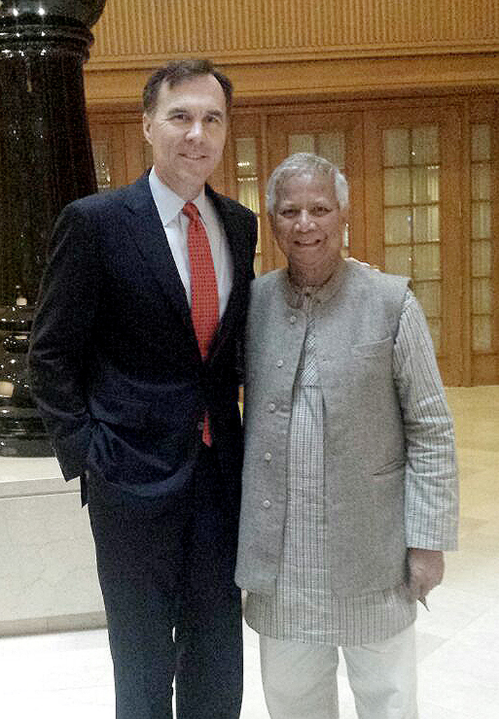 নোবেল লরিয়েট প্রফেসর মুহাম্মদ ইউনূস কানাডার অর্থমন্ত্রী বিল মরনোর সাথে এক ঘন্টাব্যাপী একটি বৈঠকে মিলিত হন। সামাজিক ব্যবসার ভূমিকা সহ উন্নয়ন কৌশল নিয়ে আলোচনার জন্য অর্থমন্ত্রী মরনো কানাডায় অবস্থানত প্রফেসর ইউনূসের সাথে তাঁর হোটেলে সাক্ষাৎ করেন। প্রফেসর ইউনূস উন্নয়ন সহযোগিতার একটি অংশ সামাজিক ব্যবসা উদ্যোগগুলোতে অর্থাৎ মানুষের সৃষ্টিশীল শক্তিকে কাজে লাগিয়ে সমাজের বিভিন্ন সমস্যা সমাধানে বিশেষভাবে নিয়োজিত করার পরামর্শ দেন। তাঁরা বিশেষ করে হাইতি ও আফ্রিকাতে ইউনূস সামাজিক ব্যবসা উদ্যোগগুলো নিয়ে কথা বলেন যেখানে বিভিন্ন সামাজিক ব্যবসাকে অর্থায়ন করার জন্য সৃষ্ট তহবিলগুলো খুবই কার্যকর প্রমাণিত হয়েছে। তাঁরা বাংলাদেশে নবীন উদ্যোক্তা কর্মসূচির অনুসরণে কানাডার আদিবাসী জনগোষ্ঠীগুলোর জন্য উদ্যোক্তা কর্মসূচি গড়ে তোলার বিষয়ে আলোচনা করেন যাতে ঐ জনগোষ্ঠীগুলোর বেকার তরুণরা নতুন নতুন ব্যবসা সৃষ্টি করে তাদের নিজেদের ও অন্যদের জন্য কর্মসংস্থান তৈরী করতে পারে। অর্থমন্ত্রী মরনো প্রফেসর ইউনূসকে তাঁর সাক্ষাতের জন্য ধন্যবাদ জানান এবং দরিদ্র দেশগুলোর বিভিন্ন সমস্যা সমাধানে ঐ দেশগুলোতে সামাজিক ব্যবসা গড়ে তুলতে সেখানে কর্মরত বৃহৎ কানাডিয়ান কোম্পানীগুলোর সম্ভাব্য ভূমিকা নিয়েও তাঁর সাথে আলোচনা করেন।