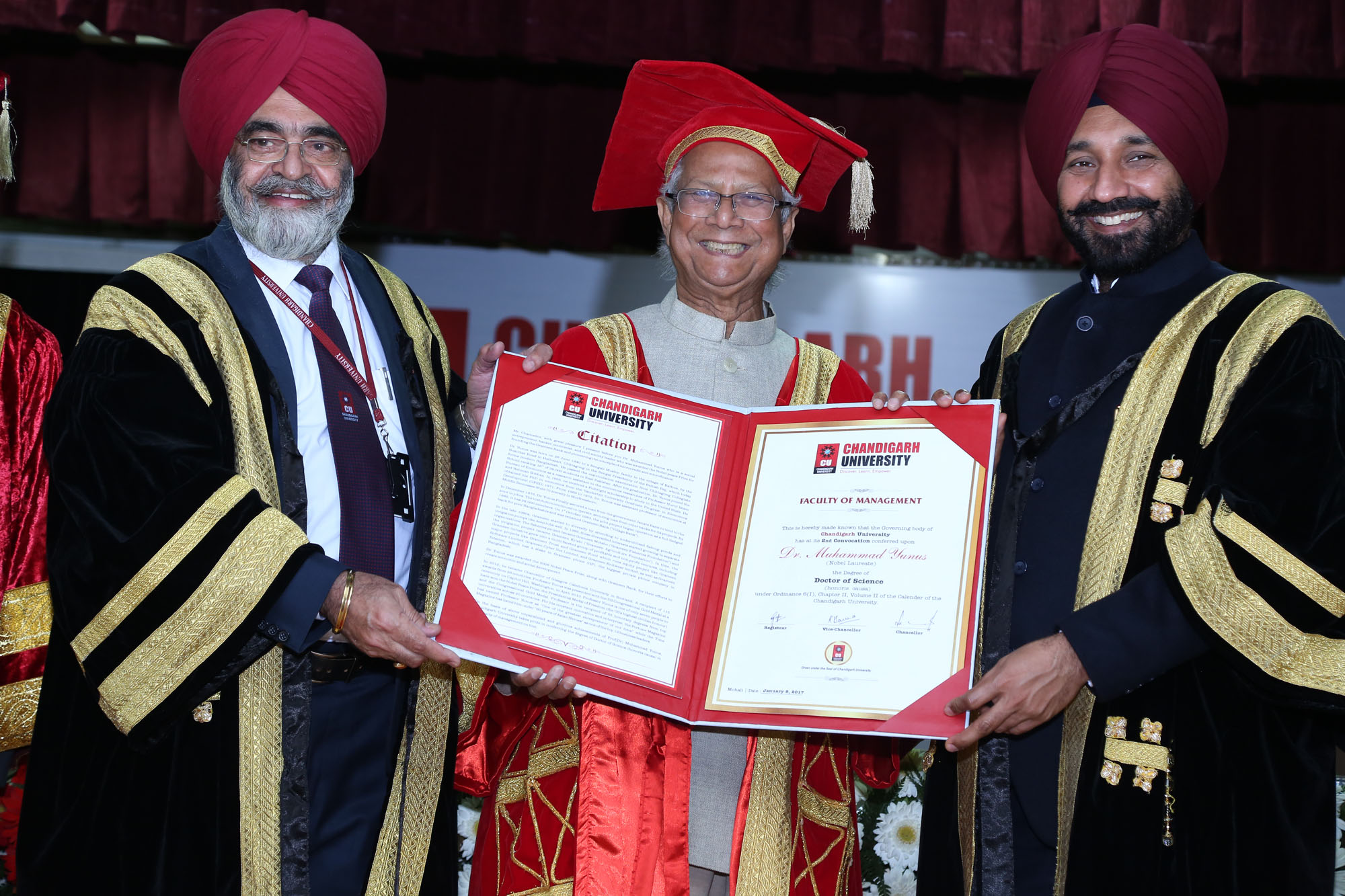 Photo Caption 1: Nobel Laureate Professor Muhammad Yunus is being conferred Honorary Doctorate by the Chancellor Mr. Santam Sing Sandhu and Vice Chancellor Dr. R. S. Bawa at Chandigarh University Convocation Ceremony on January 8, 2017 in Punjab, India.