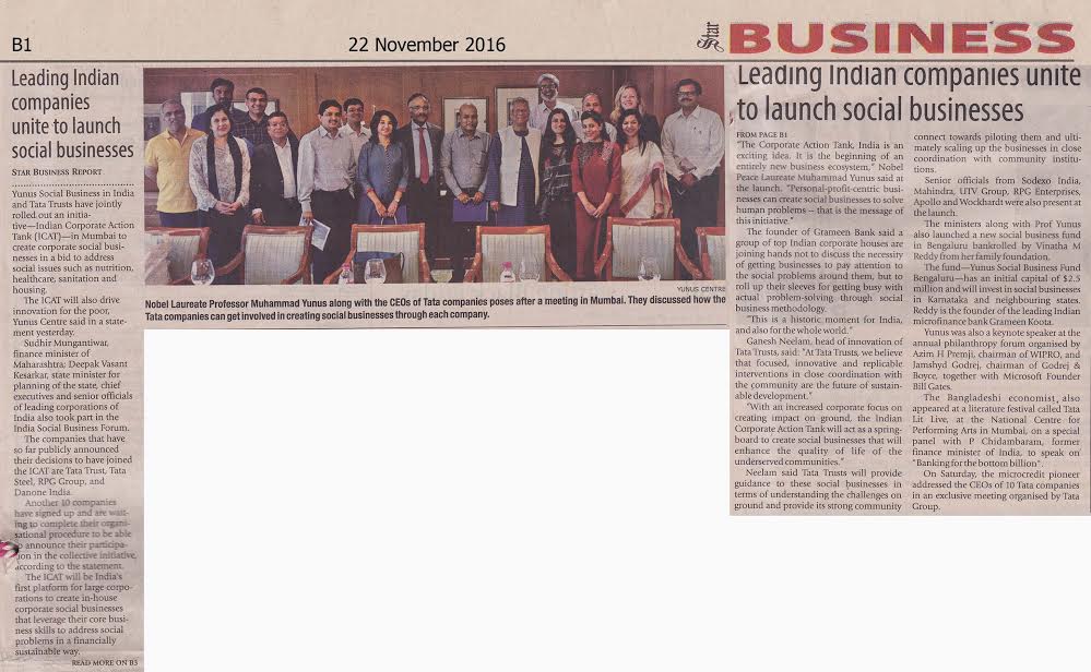 Yunus Social Business in India and Tata Trusts have jointly rolled out an initiative—Indian Corporate Action Tank (ICAT)—in Mumbai to create corporate social businesses in a bid to address social issues such as nutrition, healthcare, sanitation and housing.