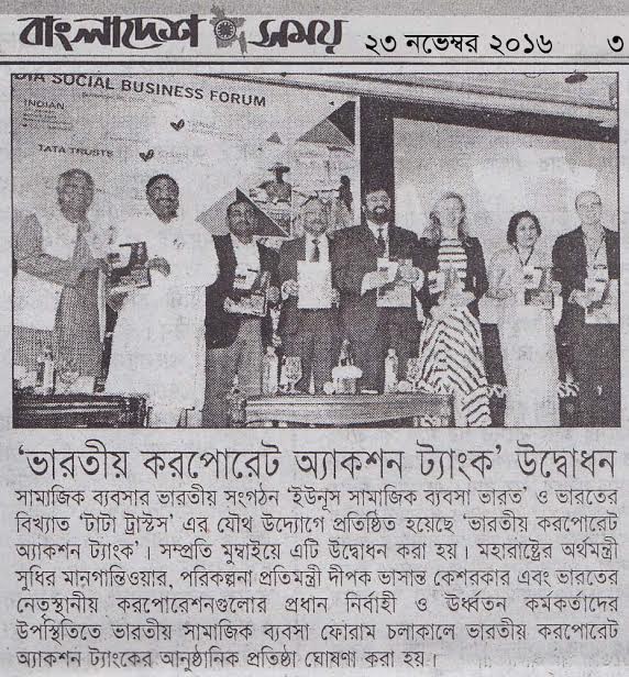 সামাজিক ব্যবসার ভারতীয় সংগঠন ‘ইউনূস সামাজিক ব্যবসা ভারত’ ও ভারতের বিখ্যাত ‘টাটা ট্রাস্টস’ এর যৌথ উদ্যোগে প্রতিষ্ঠিত হয়েছে ‘ভারতীয় করপোরেট অ্যাকশন ট্যাংক’। সম্প্রতি মুম্বাইয়ে এটি উদ্বোধন করা হয়। মহারাষ্ট্রের অর্থমন্ত্রী সুধির মানগান্তিওয়ার, পরিকল্পনা প্রতিমন্ত্রী দীপক ভাসান্ত কেশরকার এবং ভারতের নেতৃস্থানীয় করপোরেশনগুলোর প্রধান নির্বাহী ও ঊর্ধ্বতন কর্মকর্তাদের উপস্থিতিতে ভারতীয় সামাজিক ব্যবসা ফোরাম চলাকালে ভারতীয় করপোরেট অ্যাকশন ট্যাংকের আনুষ্ঠানিক প্রতিষ্ঠা ঘোষণা করা হয়।