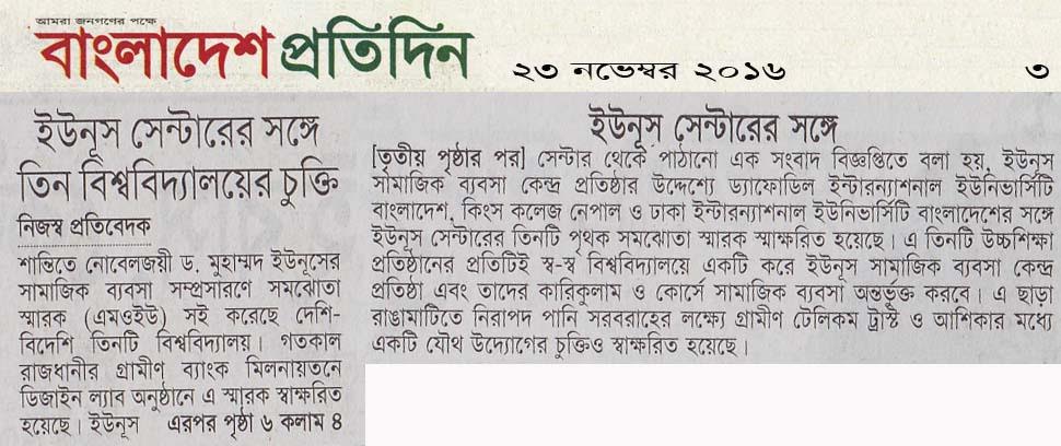 শান্তিতে নোবেলজয়ী ড. মুহাম্মদ ইউনূসের সামাজিক ব্যবসা সম্প্রসারণে সমঝোতা স্মারক (এমওইউ) সই করেছে দেশি-বিদেশি তিনটি বিশ্ববিদ্যালয়। গতকাল রাজধানীর গ্রামীণ ব্যাংক মিলনায়তনে ডিজাইন ল্যাব অনুষ্ঠানে এ স্মারক স্বাক্ষরিত হয়েছে। ইউনূস     সেন্টার থেকে পাঠানো এক সংবাদ বিজ্ঞপ্তিতে বলা হয়, ইউনূস সামাজিক ব্যবসা কেন্দ্র প্রতিষ্ঠার উদ্দেশ্যে ড্যাফোডিল ইন্টারন্যাশনাল ইউনিভার্সিটি বাংলাদেশ, কিংস কলেজ নেপাল ও ঢাকা ইন্টারন্যাশনাল ইউনিভার্সিটি বাংলাদেশের সঙ্গে ইউনূস সেন্টারের তিনটি পৃথক সমঝোতা স্মারক স্মাক্ষরিত হয়েছে। এ তিনটি উচ্চশিক্ষা প্রতিষ্ঠানের প্রতিটিই স্ব-স্ব বিশ্ববিদ্যালয়ে একটি করে ইউনূস সামাজিক ব্যবসা কেন্দ্র প্রতিষ্ঠা এবং তাদের কারিকুলাম ও কোর্সে সামাজিক ব্যবসা অন্তর্ভুক্ত করবে। এ ছাড়া রাঙামাটিতে নিরাপদ পানি সরবরাহের লক্ষ্যে গ্রামীণ টেলিকম ট্রাস্ট ও আশিকার মধ্যে একটি যৌথ উদ্যোগের চুক্তিও স্বাক্ষরিত হয়েছে।