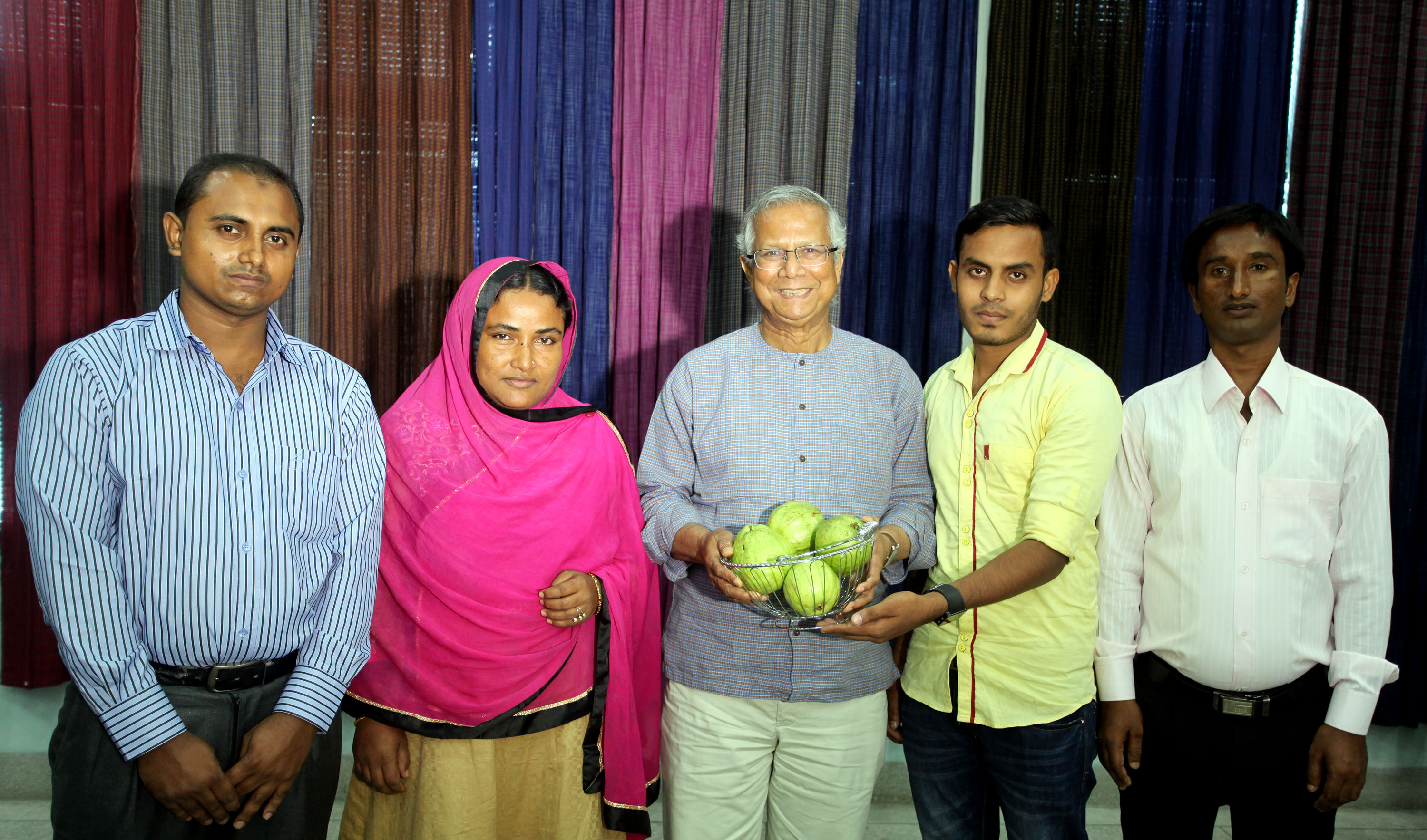 Photo Caption One: Investments into six social businesses including four New Entrepreneur(NU) projects were announced on Thursday at the 375th Social Business Design Lab. The New Entrepreneurs, children of Grameen Bank borrowers are seen in the photo with Nobel Laureate Professor Muhammad Yunus.