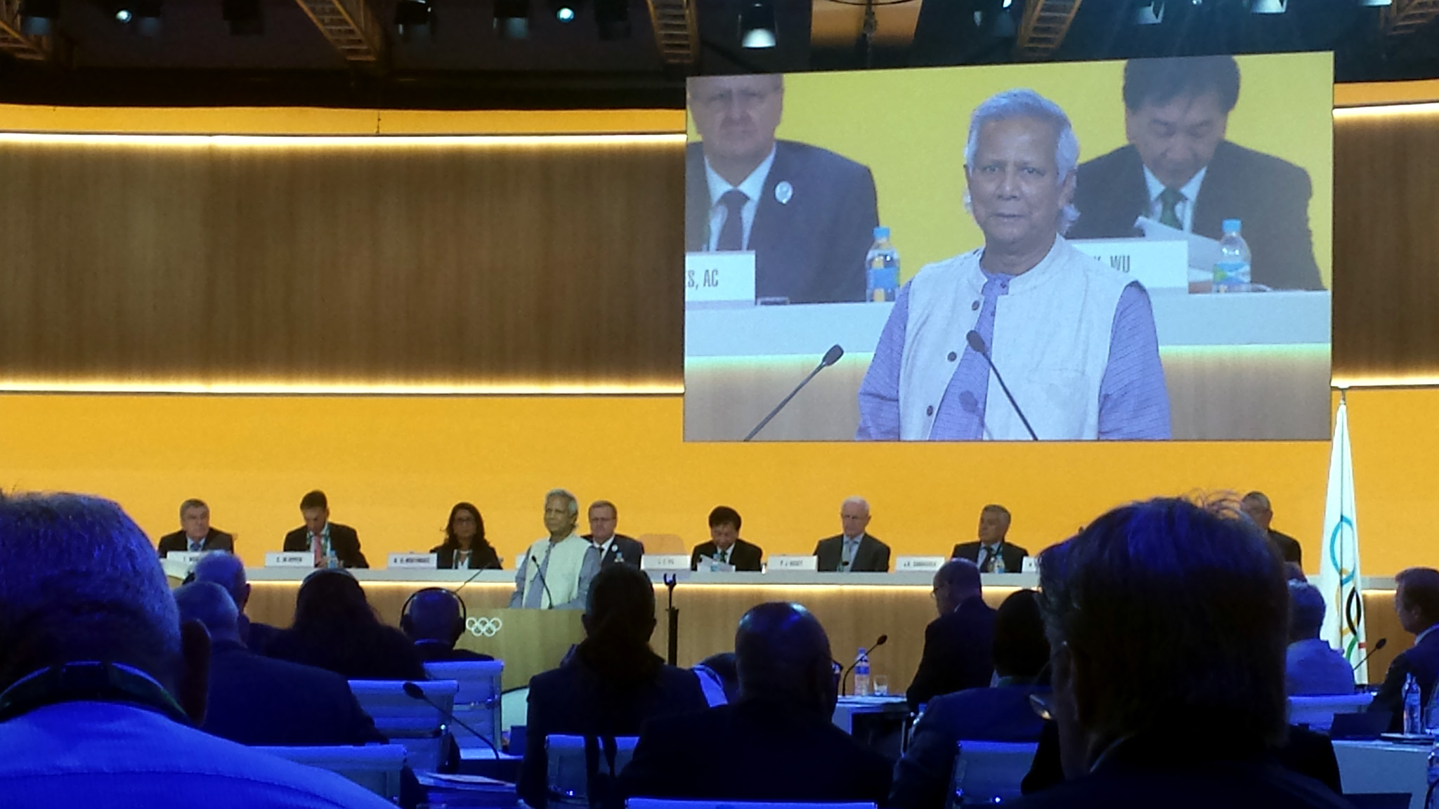 ছবির ক্যাপশন-১ঃ ৩ আগষ্ট ২০১৬ আন্তর্জাতিক অলিম্পিক কমিটির ১২৯তম সেশনে ভাষণ দিচ্ছেন নোবেল লরিয়েট প্রফেসর মুহাম্মদ ইউনূস ।