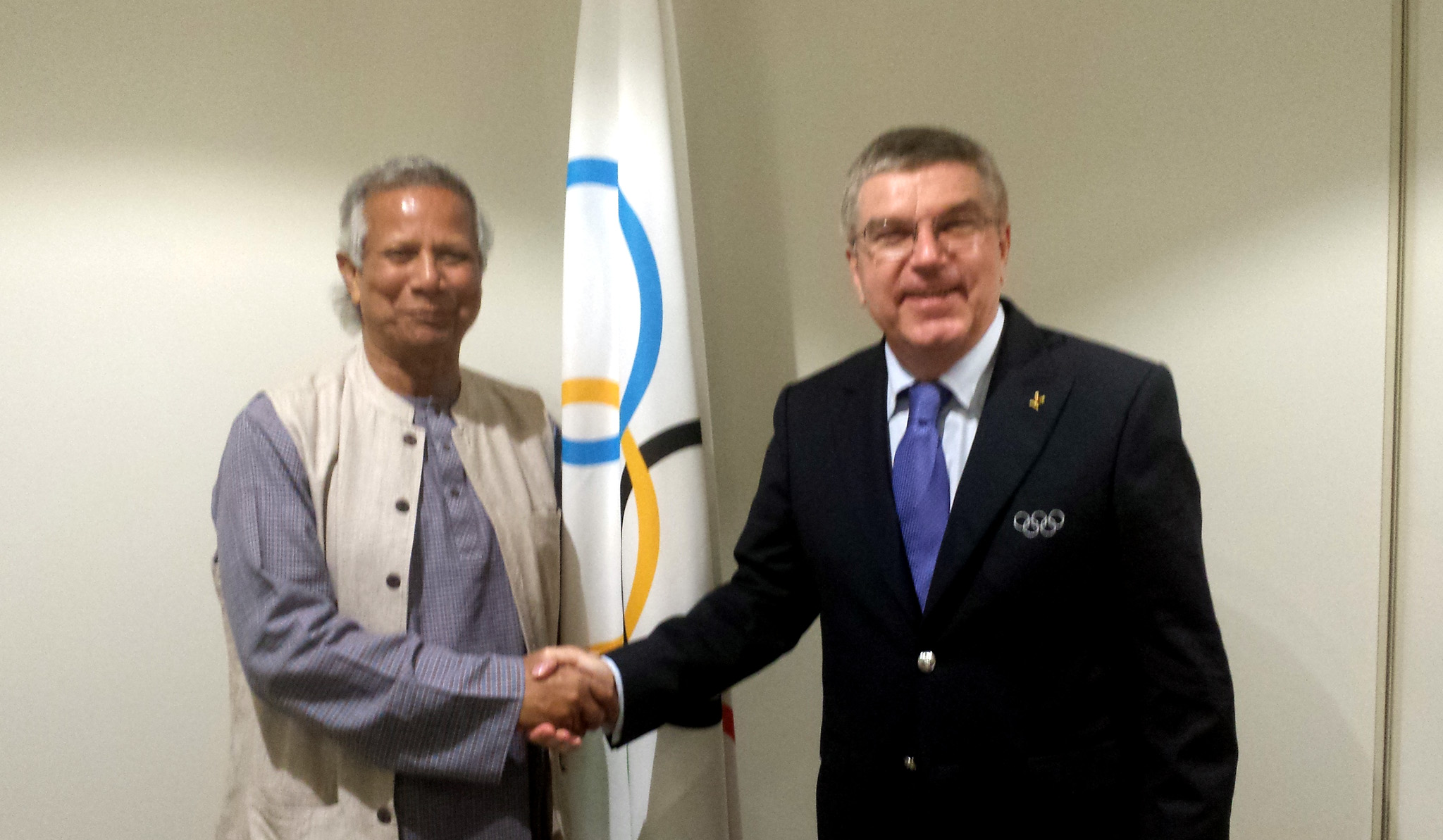 ছবির ক্যাপশন-৩ঃ আন্তর্জাতিক অলিম্পিক কমিটির ১২৯তম সেশনে তাঁর ভাষণের পূর্বে প্রফেসর মুহাম্মদ ইউনূসকে গেস্ট অব অনার হিসেবে অভ্যর্থনা জানাচ্ছেন অলিম্পিক প্রেসিডেন্ট জনাব টমাস বাখ। প্রফেসর ইউনূস এই সেশনে মূল অলিম্পিক বক্তব্য প্রদান করেন।