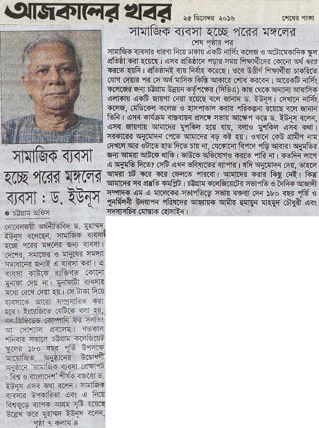 নোবেলজয়ী অর্থনীতিবিদ ড. মুহাম্মদ ইউনূস বলেছেন, সামাজিক ব্যবসা হচ্ছে পরের মঙ্গলের জন্য ব্যবসা। দেশের, সমাজের ও মানুষের সমস্যা সমাধানের জন্যই এ ব্যবসা করা। এ ব্যবসা কাউকে ব্যক্তিগত কোনো মুনাফা দেয় না। মুনাফাটা ব্যবসার মধ্যে রেখে দেয়া হয়। সে টাকা দিয়ে ব্যবসাকে আরো সম্প্রসারিত করা হবে। ইংরেজিতে যেটিকে বলা হয়, নন-ডিভিডেন্ড কোম্পানি ফর সলভিং আ সোশ্যাল প্রবলেম। গতকাল শনিবার সকালে চট্টগ্রাম কলেজিয়েট স্কুলের ১৮০ বছর পূর্তি উপলক্ষে আয়োজিত অনুষ্ঠানের উদ্বোধনী অনুষ্ঠানে ‘সামাজিক ব্যবসা প্রেক্ষাপট : বিশ্ব ও বাংলাদেশ’ শীর্ষক বক্তব্যে ড. ইউনূস এসব কথা বলেন। সামাজিক ব্যবসার উপকারিতা এবং এ নিয়ে বিশ্বজুড়ে ব্যাপক আগ্রহ সৃষ্টি হয়েছে উল্লেখ করে মুহাম্মদ ইউনূস বলেন, সামাজিক ব্যবসার ধারণা নিয়ে ঢাকায় একটি নার্সিং কলেজ ও অটোমেকানিক স্কুল প্রতিষ্ঠা করা হয়েছে। এসব প্রতিষ্ঠানে পড়ার সময় শিক্ষার্থীদের কোনো অর্থ খরচ করতে হয়নি। প্রতিষ্ঠানই ব্যয় নির্বাহ করেছে। তবে উত্তীর্ণ শিক্ষার্থীরা চাকরিতে যোগ দেয়ার পর সে অর্থ মাসিক কিস্তি আকারে শোধ করবেন। আরেকটি নার্সিং কলেজের জন্য চট্টগ্রাম উন্নয়ন কর্তৃপক্ষের (সিডিএ) কাছ থেকে অন্যান্য আবাসিক এলাকায় একটি জায়গা নেয়া হয়েছে বলে জানান ড. ইউনূস। সেখানে নার্সিং কলেজ, মেডিকেল কলেজ ও হাসপাতাল করার পরিকল্পনা রয়েছে বলে জানান তিনি। এসব কার্যক্রম বাস্তবায়ন প্রসঙ্গে সভায় আক্ষেপ করে ড. ইউনূস বলেন, এসব জায়গায় আমাদের মুশকিল হয়ে যায়, বলাও মুশকিল এসব কথা। সরকারের অনুমোদন পেতে আমাদের বড় কষ্ট হয়। ওখানে কেউ গ্রামীণ নাম দেখলে আর ওটাতে হাত দিতে চায় না, যেকোনো বিপদে পড়ি আবার! অনুমতির জন্য আমরা আটকে থাকি। কাউকে অভিযোগও করতে পারি না। কতদিন লাগে এ অনুমতি দিতে? সেটি এখন ভবিষ্যতের ব্যাপার। যদি অনুমোদন দেয়, তাহলে আমরা চট করে করে ফেলতে পারবো। আমাদের করার কিছু নেই। কিন্তু আমাদের সব প্রস্তুতি কমপ্লিট। চট্টগ্রাম কলেজিয়েটের সভাপতি ও দৈনিক আজাদী সম্পাদক এম এ মালেকের সভাপতিত্বে সভায় বক্তব্য দেন ১৮০ বছর পূর্তি ও পুনর্মিলনী উদযাপন পরিষদের আহŸায়ক আমীর হুমায়ুন মাহমুদ চৌধুরী এবং সদস্যসচিব মোস্তাক হোসাইন।