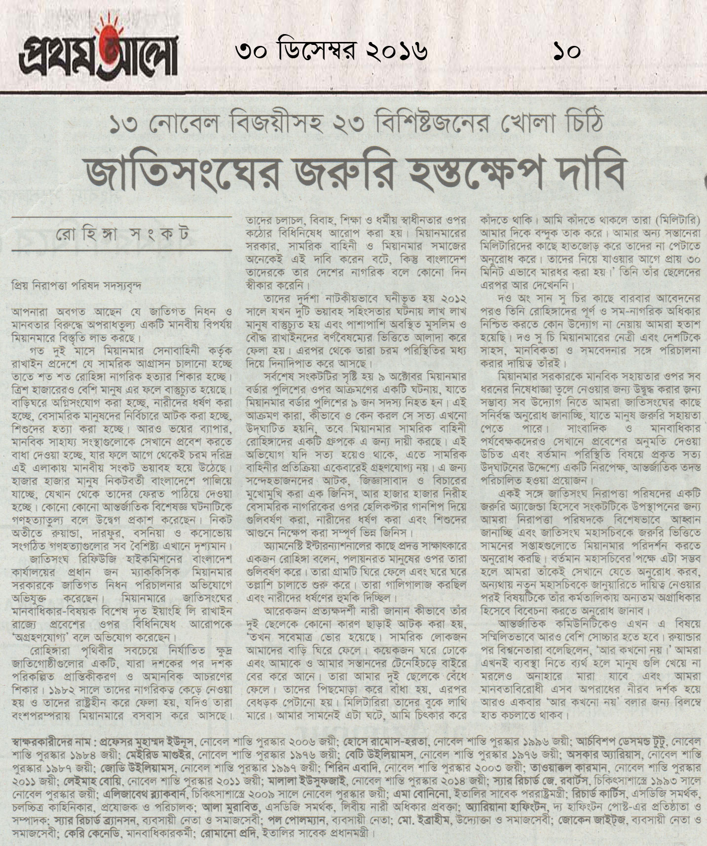 জাতিসংঘের হস্তক্ষেপ চাইলেন ১৩ নোবেলজয়ী ও ১০ বিশিষ্টজন