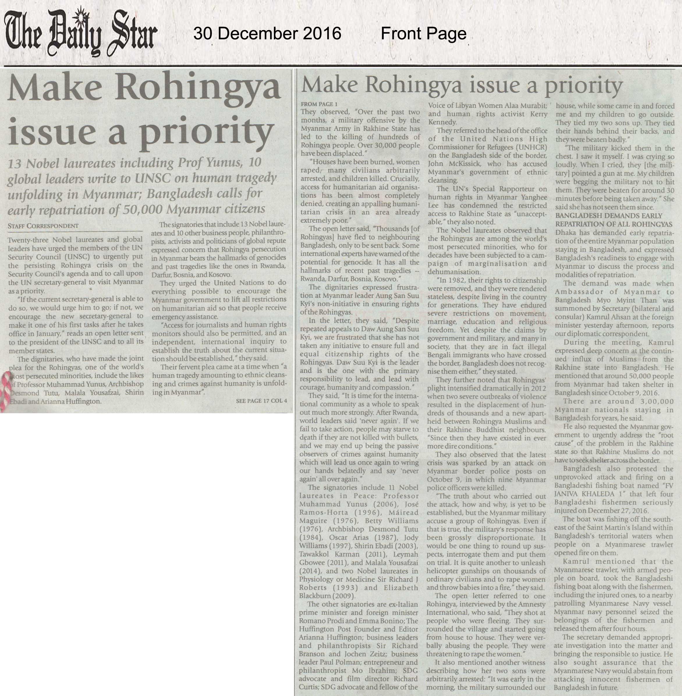 Twenty-three Nobel laureates and global leaders have urged the UN Security Council (UNSC) members to urgently put the Rohingya issue on its agenda and called upon the UN secretary-general to visit Myanmar as a priority.