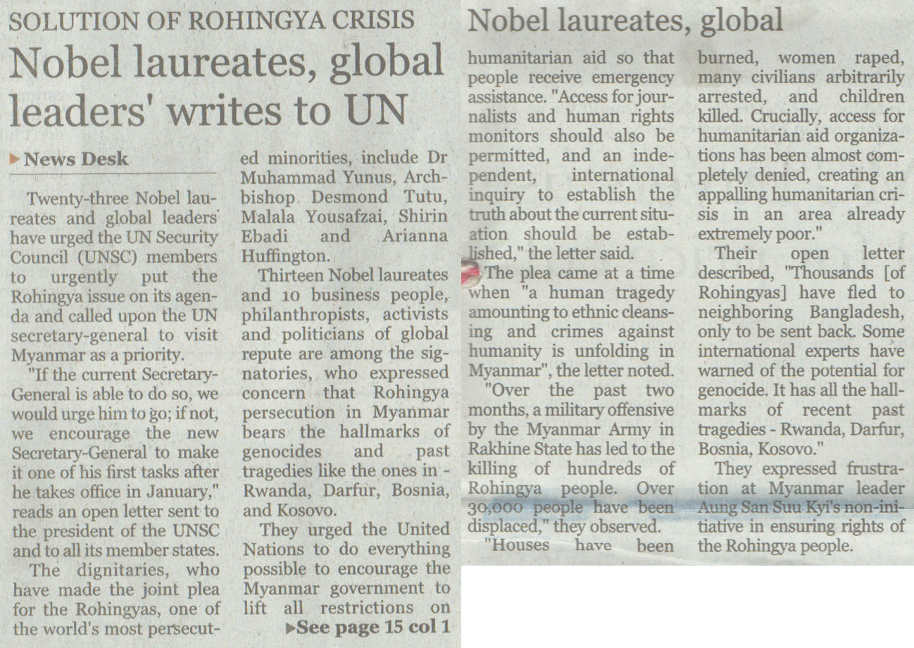 Twenty-three Nobel laureates and global leaders have urged the UN Security Council (UNSC) members to urgently put the Rohingya issue on its agenda and called upon the UN secretary-general to visit Myanmar as a priority.