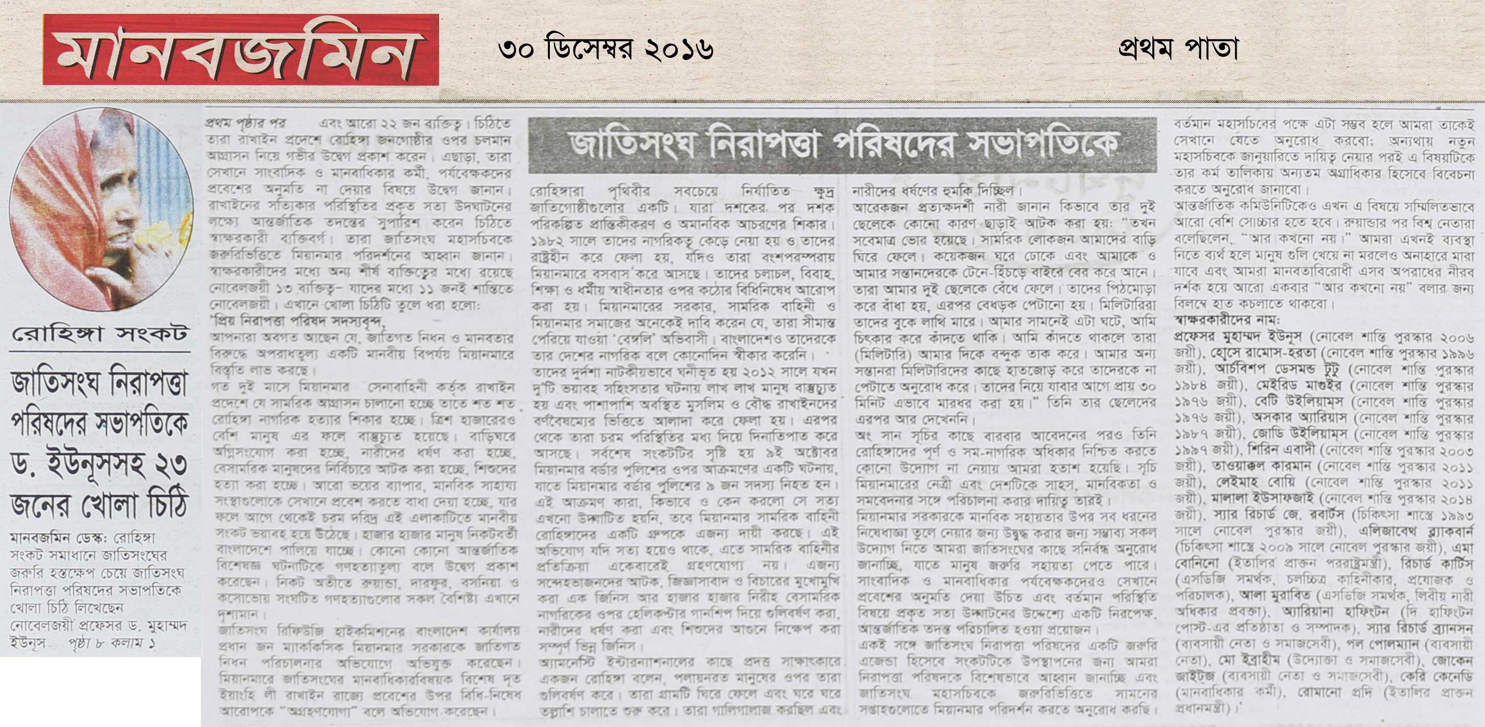 রোহিঙ্গা সংকট সমাধানে জাতিসংঘের জরুরি হস্তক্ষেপ চেয়ে জাতিসংঘ নিরাপত্তা পরিষদের সভাপতিকে খোলা চিঠি লিখেছেন নোবেলজয়ী প্রফেসর ড. মুহাম্মদ ইউনূস এবং আরো ২২ জন ব্যক্তিত্ব। চিঠিতে তারা রাখাইন প্রদেশে রোহিঙ্গা জনগোষ্ঠীর ওপর চলমান আগ্রাসন নিয়ে গভীর উদ্বেগ প্রকাশ করেন। এছাড়া, তারা সেখানে সাংবাদিক ও মানবাধিকার কর্মী, পর্যবেক্ষকদের প্রবেশের অনুমতি না দেয়ার বিষয়ে উদ্বেগ জানান। রাখাইনের সত্যিকার পরিস্থিতির প্রকৃত সত্য উদঘাটনের লক্ষ্যে আন্তর্জাতিক তদন্তের সুপারিশ করেন চিঠিতে স্বাক্ষরকারী ব্যক্তিবর্গ। তারা জাতিসংঘ মহাসচিবকে জরুরিভিত্তিতে মিয়ানমার পরিদর্শনের আহ্বান জানান। স্বাক্ষরকারীদের মধ্যে অন্য শীর্ষ ব্যক্তিত্বের মধ্যে রয়েছে নোবেলজয়ী ১৩ ব্যক্তিত্ব- যাদের মধ্যে ১১ জনই শান্তিতে নোবেলজয়ী। এখানে খোলা চিঠিটি তুলে ধরা হলো: