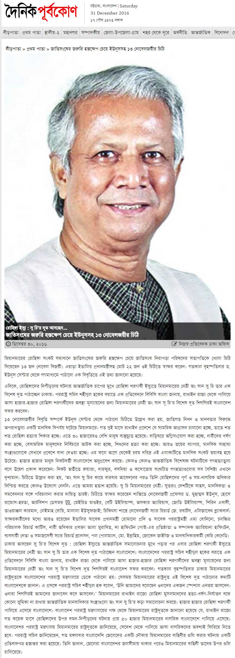 ১৩ নোবেলজয়ীর বিবৃতি সম্পর্কে ইউনূস সেন্টার থেকে পাঠানো চিঠিতে উল্লেখ করা হয়, জাতিগত নিধন ও মানবতার বিরুদ্ধে অপরাধতুল্য একটি মানবিক বিপর্যয় ঘটেছে মিয়ানমারে। গত দুই মাসে রাখাইন প্রদেশে যে সামরিক আগ্রাসন চালানো হচ্ছে, তাতে শত শত রোহিঙ্গা হত্যার শিকার হচ্ছে। এতে ৩০ হাজারেরও বেশি মানুষ বাস্তুচ্যুত হয়েছে। বাড়িঘরে অগ্নিসংযোগ করা হচ্ছে, নারীদের ধর্ষণ করা হচ্ছে, বেসামরিক মানুষদের নির্বিচারে আটক করা হচ্ছে, শিশুদের হত্যা করা হচ্ছে। আরও ভয়ের ব্যাপার, মানবিক সাহায্য সংস্থাগুলোকে সেখানে প্রবেশে বাধা দেওয়া হচ্ছে। এর ফলে আগে থেকেই চরম দরিদ্র এই এলাকাটিতে মানবিক সংকট ভয়াবহ হয়ে উঠেছে। হাজার হাজার মানুষ নিকটবর্তী বাংলাদেশে অনুপ্রবেশ করছে। কোনও কোনও আন্তর্জাতিক বিশেষজ্ঞ ঘটনাটিকে গণহত্যাতুল্য বলে উদ্বেগ প্রকাশ করেছেন। নিকট অতীতে রুয়ান্ডা, দারফুর, বসনিয়া ও কসোভোয় সংঘঠিত গণহত্যাগুলোর সব বৈশিষ্ট্য এখানে দৃশ্যমান। চিঠিতে উল্লেখ করা হয়, ‘অং সান সু চির কাছে বারবার আবেদনের পরও তিনি রোহিঙ্গাদের পূর্ণ ও সম-নাগরিক অধিকার নিশ্চিত করতে কোনও উদ্যোগ নেননি। এতে আমরা হতাশ হয়েছি। সু চি মিয়ানমারের নেত্রী। সুতরাং দেশটিকে সাহস, মানবিকতা ও সমবেদনার সঙ্গে পরিচালনা করার দায়িত্ব তারই। চিঠিতে স্বাক্ষর করেছেন শান্তিতে নোবেলজয়ী প্রফেসর ড. মুহাম্মদ ইউনূস, হোসে রামোস-হরতা, আর্চবিশপ ডেসমন্ড টুটু, মেইরিড মাগুইর, বেটি উইলিয়াম্স, অসকার অ্যারিয়াস, জোডি উইলিয়াম্স, শিরিন এবাদী, তাওয়াক্কল কারমান, লেইমাহ বোয়ি, মালালা ইউসুফজাই; চিকিৎসা শাস্ত্রে নোবেলজয়ী স্যার রিচার্ড জে. রবার্টস, এলিজাবেথ ব্ল্যাকবার্ন। স্বাক্ষরকারীদের মধ্যে আরও রয়েছেন ইতালির সাবেক প্রধানমন্ত্রী রোমানো প্রদি ও সাবেক পররাষ্ট্রমন্ত্রী এমা বোনিনো, চলচ্চিত্র পরিচালক রিচার্ড কার্টিস, নারী অধিকার প্রবক্তা আলা মুরাবিত, দ্য হাফিংটন পোস্ট-এর প্রতিষ্ঠাতা ও সম্পাদক অ্যারিয়ানা হাফিংটন, ব্যবসায়ী নেতা ও সমাজসেবী স্যার রিচার্ড ব্র্যানসন, পল পোলম্যান, মো. ইব্রাহিম, জোকেন জাইট্জ ও মানবাধিকারকর্মী কেরি কেনেডি।
