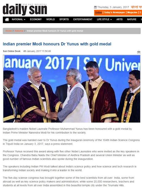The gold medal was handed over to Dr Yunus during the inaugural ceremony of the 104th Indian Science Congress in Triputi India on January 3, 2017, says a press statement.