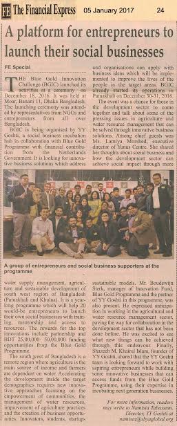 innovations include partnership and BDT 25,00,000- 50,00,000 funding opportunities from the Blue Gold Programme.The south west of Bangladesh is a remote region where agriculture is the main source of income and farmers are dependent on water. Accelerating the development inside the target demographics requires new innovative approaches focusing on the empowerment of communities, the management of water resources, improvement of agriculture practices and the creation of business opportunities. Innovators, students, startups and organisations can apply with business ideas which will be implemented to improve the lives of the people in the target areas. BGIC already started its operations in Patuakhali on December 30-31, 2016.