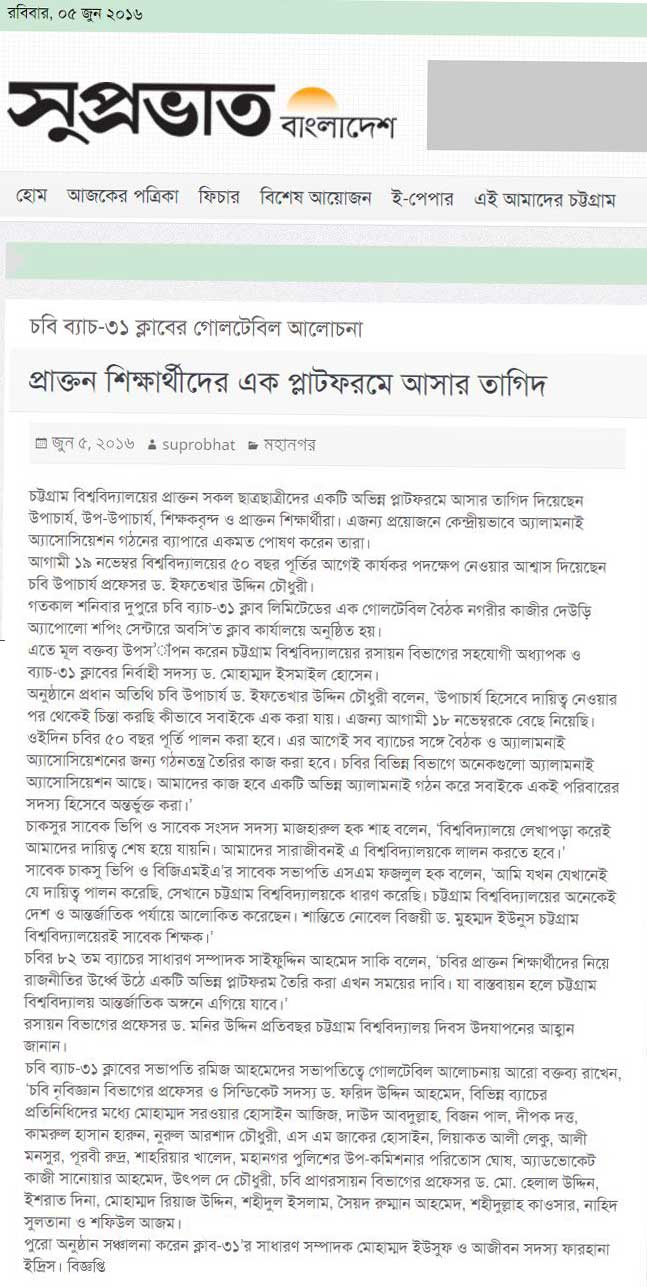 এতে মূল বক্তব্য উপস’াপন করেন চট্টগ্রাম বিশ্ববিদ্যালয়ের রসায়ন বিভাগের সহযোগী অধ্যাপক ও ব্যাচ-৩১ ক্লাবের নির্বাহী সদস্য ড. মোহাম্মদ ইসমাইল হোসেন।