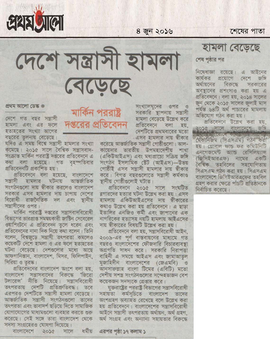 প্রতিবেদনের বাংলাদেশ অংশে বলা হয়, বাংলাদেশ সন্ত্রাসবাদের বিরুদ্ধে ‘জিরো টলারেন্স’ নীতি নিয়েছে। সন্ত্রাসবিরোধী তৎপরতায় দেশটি প্রতিশ্রুতিবদ্ধ। তবে এরপরও দেশটিতে সন্ত্রাসী হামলা বেড়েছে। আন্তর্জাতিক সন্ত্রাসী সংগঠনগুলো তাদের তৎপরতা এবং ভাবাদর্শ ছড়িয়ে দিতে সামাজিক যোগাযোগের মাধ্যমগুলো ব্যবহার করতে শুরু করেছে। সেই সঙ্গে তারা বাংলাদেশ থেকে সদস্য সংগ্রহেরও ঘোষণা দিয়েছে।