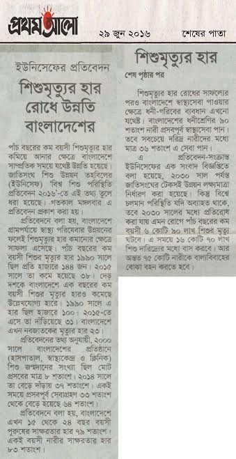 প্রতিবেদনে বলা হয়, বাংলাদেশে গ্রামপর্যায়ে স্বাস্থ্য পরিষেবার উন্নয়নের ফলেই শিশুমৃত্যুর হার কমানোর ক্ষেত্রে সাফল্য এসেছে। পাঁচ বছরের কম বয়সী শিশুর মৃত্যুর হার ১৯৯০ সালে ছিল প্রতি হাজারে ১৪৪ জন। ২০১৫ সালে তা কমে হয়েছে ৩৮। দেড় দশকে বাংলাদেশে এক বছরের কম বয়সী শিশুর মৃত্যুর হারও কমেছে উল্লেখযোগ্য হারে। ১৯৯০ সালে এ হার ছিল হাজারে ১০০। ২০১৫-তে এসে তা দাঁড়িয়েছে ৩১। বাংলাদেশে এখন নবজাতকের মৃত্যুর হার ২৩।