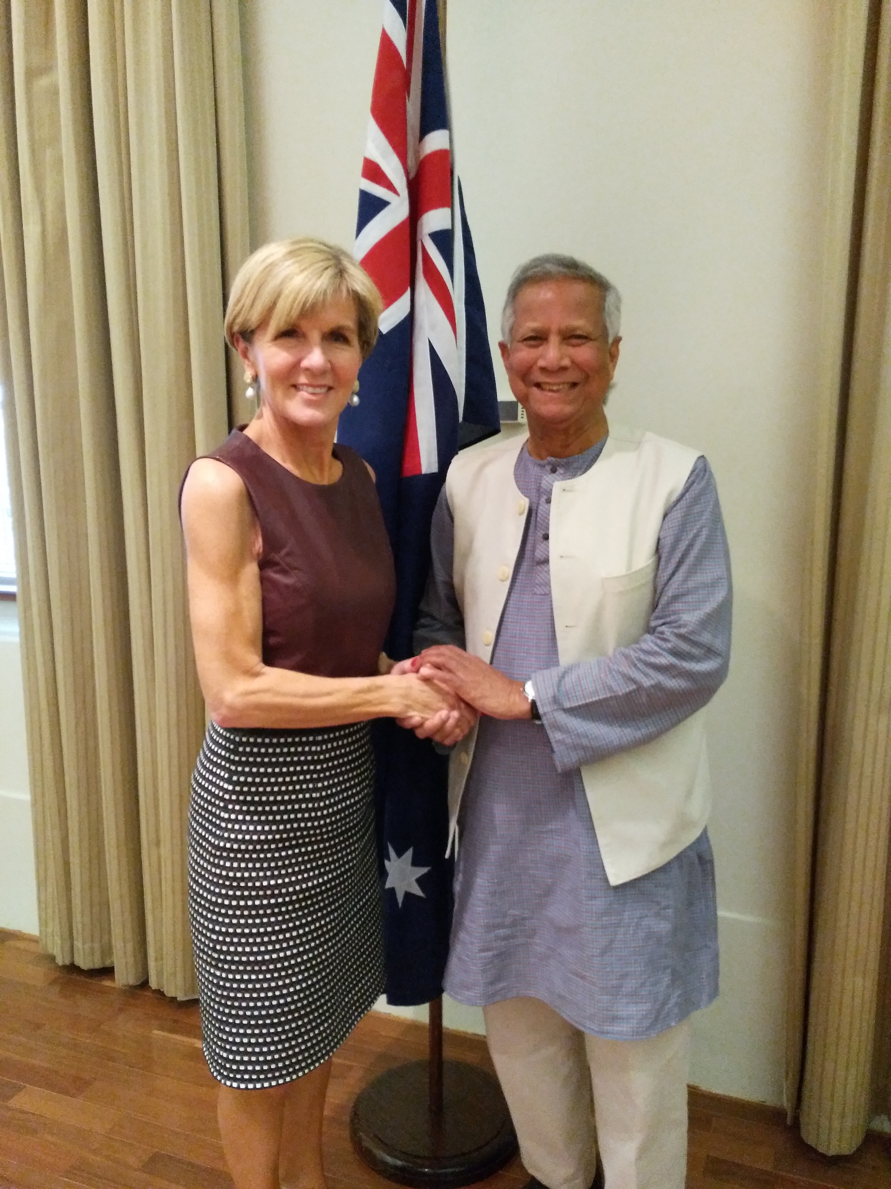 In Melbourne, and as a continuation of Canberra discussion he met with Foreign Minister Hon Julie Bishop MP who is interested to introduce social business into her overseas development programs for the Pacific region in particular for Papua New Guinea and the Solomon Islands which have been struggling to make progress towards the UN SDGs. Ms Bishop and Professor Yunus discussed the possibility of creating a social business fund to invest into in those and other countries in the region to ensure optimal and repeated use of development aid resources.