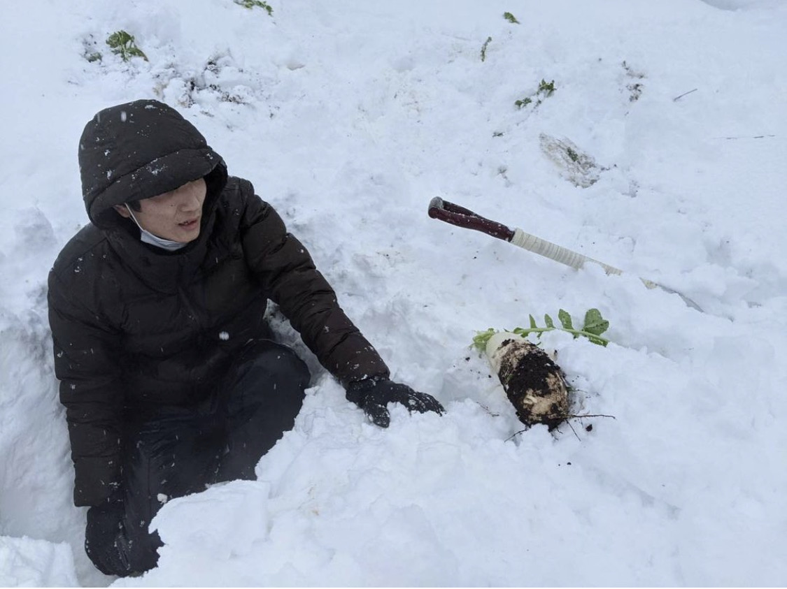 Honbou now occupies an old farm house that is called in Nishikawa village, Yamagata prefecture, in Northern Japan. He also works at the vegetable farm next to this old farm house three days a week growing potatoes, garlic and green vegetables. He sells his harvest at the local market. The work is absorbing for he starts at the crack of dawn but he already making a bit of profit. Last winter, Honbou made a name for himself for his special winter raddish. Fresh and juicy, the white raddish, termed Yukidaikon (Snow-laden raddish). The juicy and sweet raddish is nurtured under layers of pure snow that falls over 6 months in the area. “The radish has a sweet taste and attracts many consumers,” he said.